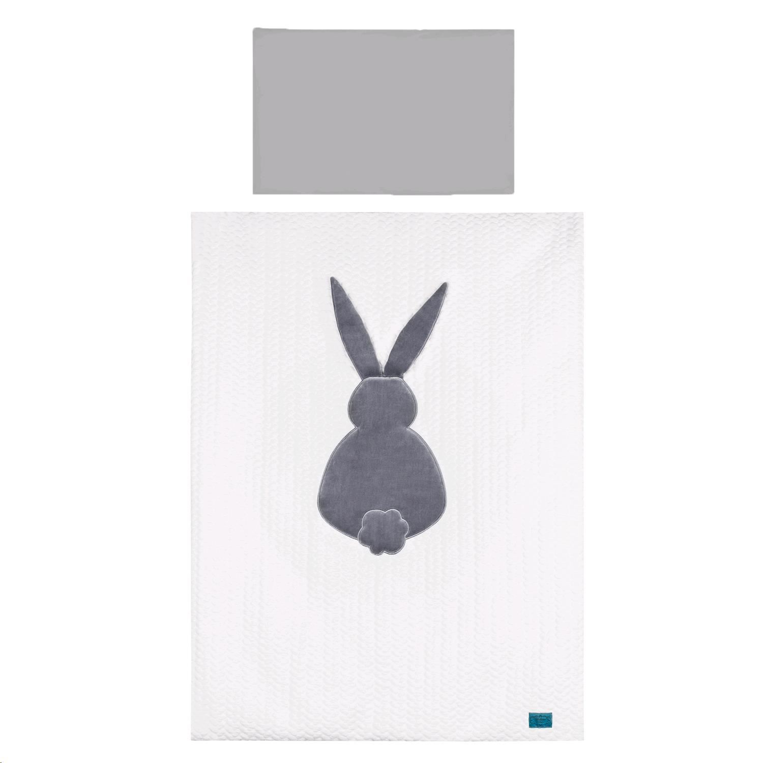 Dětská 3-dílná souprava do postýlky Belisima Králíček. Souprava je z jedné strany z úpletového materiálu zdobena 3D vzorem a roztomilým plyšovým králíčkem. Druhá strana je bavlněná. Je vyrobena z měkkého, příjemného materiálu. Obsahuje povlečení na polštářek cca 40x60 cm, povlečení na peřinku cca 100x135 cm a mantinel cca 31x175 cm. Složení: vrchní úpletová strana: 50% bavlna, 50% polyester. Spodní strana: 100% bavlna.