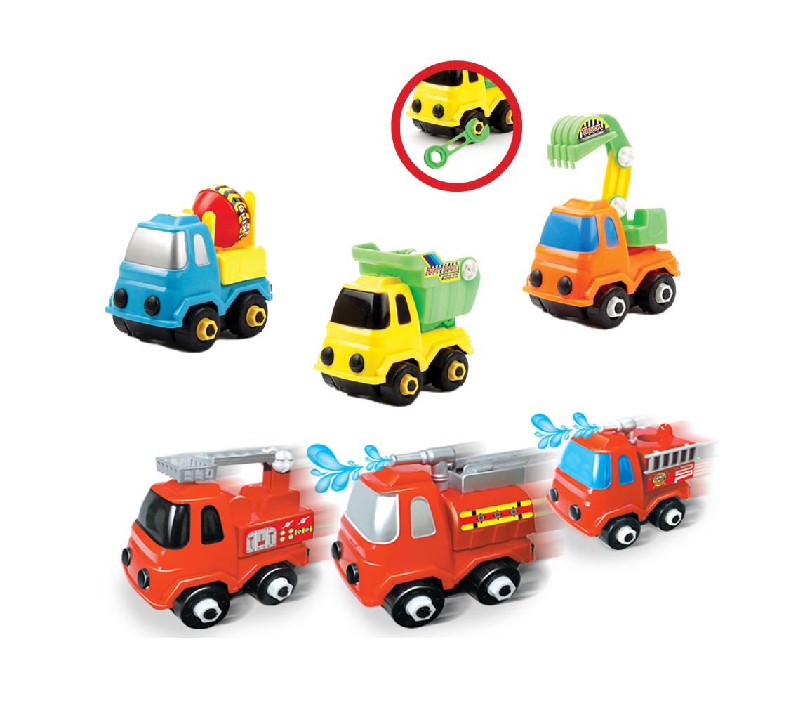 Auta šroubovací 3 ks. Rozměry auta 10x8x9 cm. 2 varianty - stavební, hasičské. Volná kola.