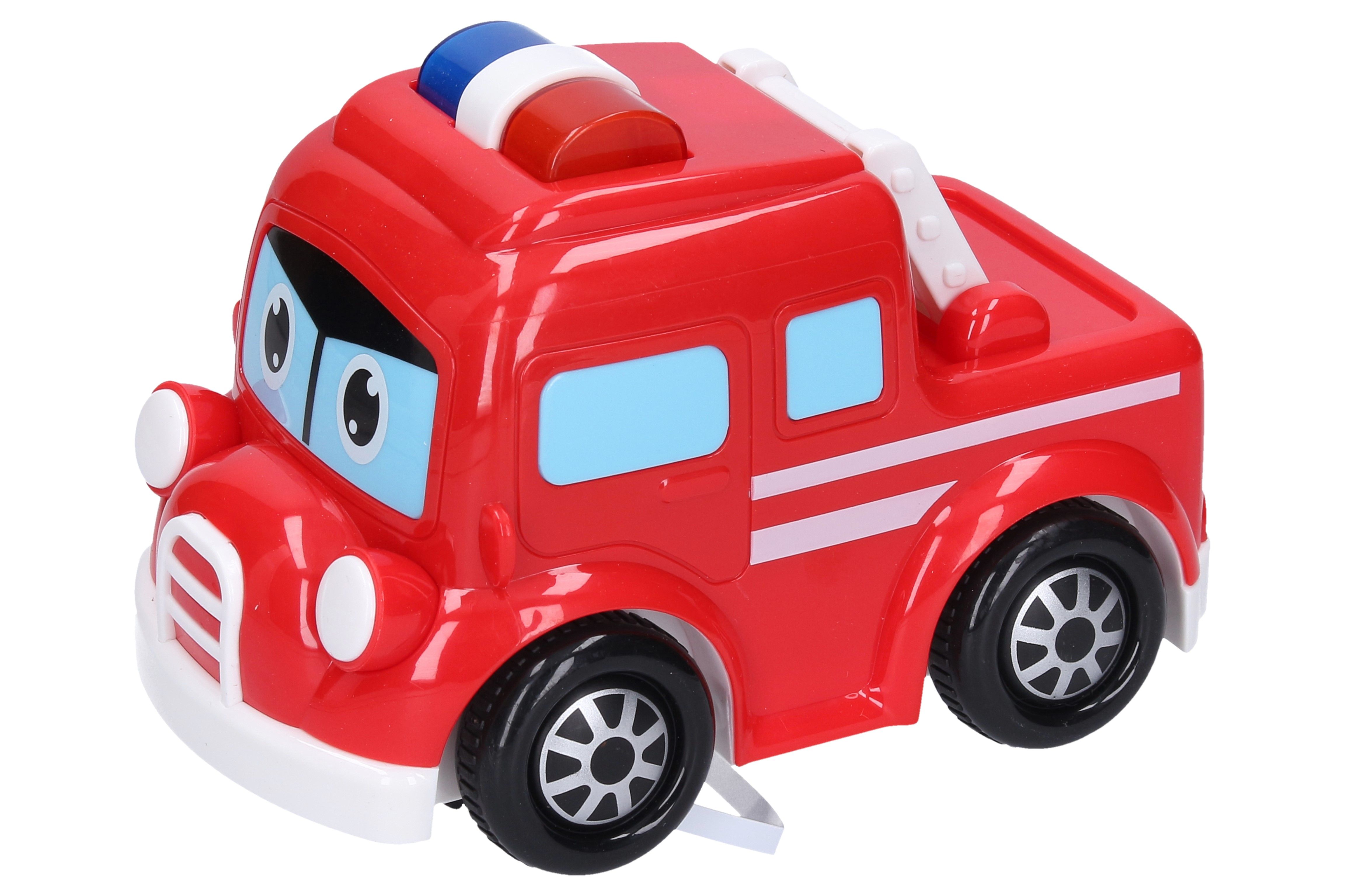 Auto hasičské s efekty. Velikost 15cm. Volná kola. Světelné a zvukové efekty. 2xAAA baterie součástí. Tlačítkem na střeše se spouští zvuky startování, houkání, blikají majáky. Dotykem na střeše a na kapotě se spouští melodie.