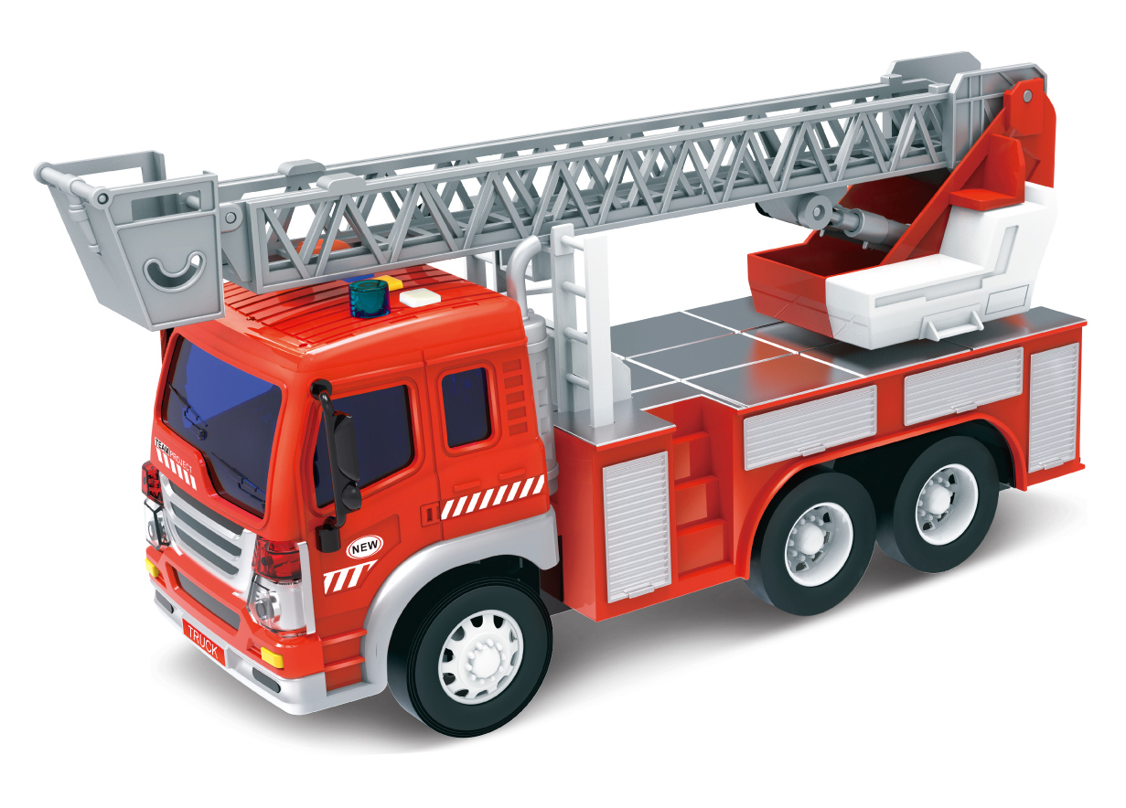 Auto hasičské se žebříkem a efekty. Velikost 28 cm. Na setrvačník. Světelné a zvukové efekty - tlačítka na kabině. 3xAG13 baterie součástí.