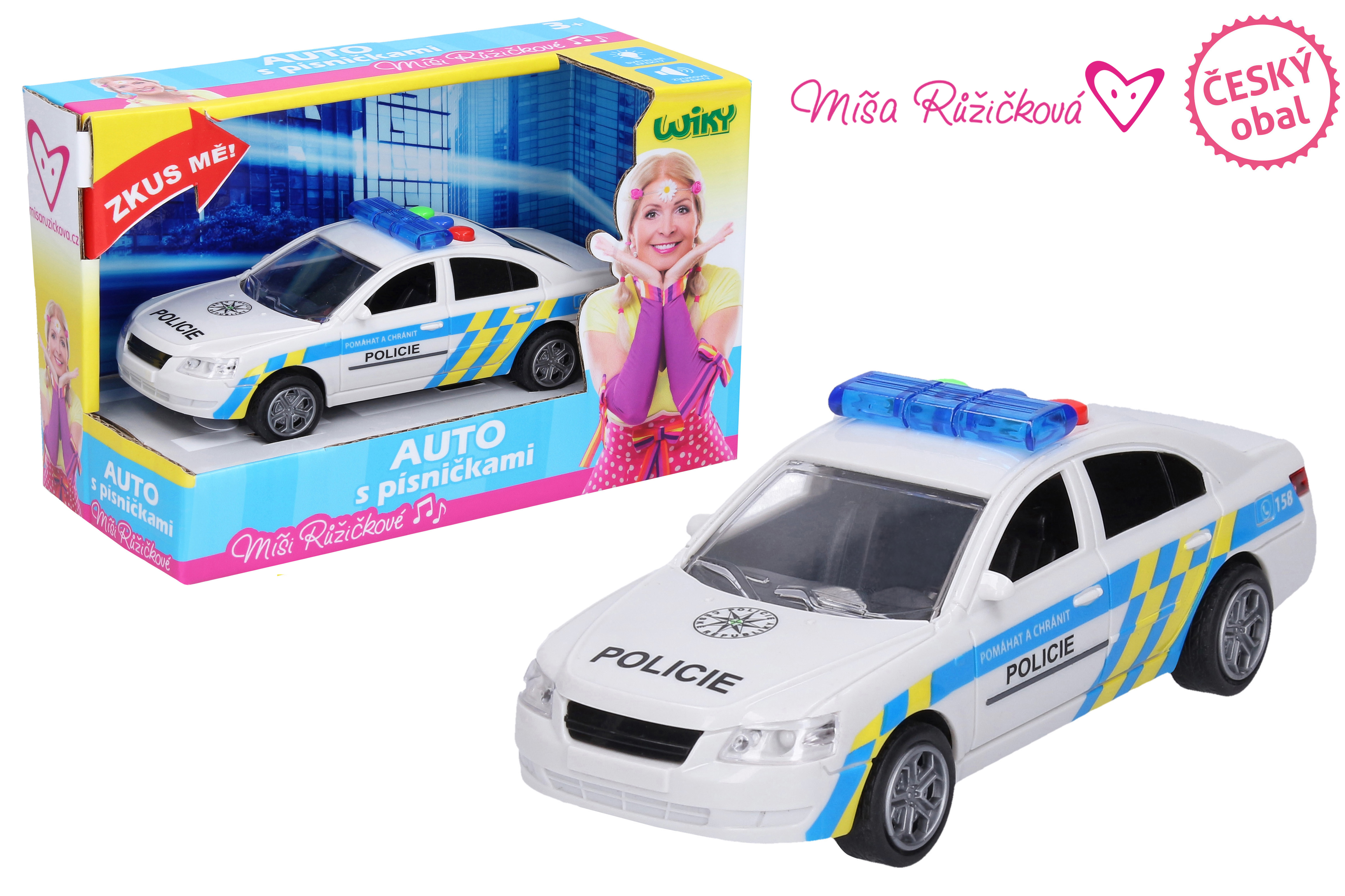 Auto policejní - Míša Růžičková. Velikost 15,5 cm. Na setrvačník. Světelné a zvukové efekty, tlačítky na střeše auta 3 písníčky Míši Růžičkové - Policejní, Sanitka, Popeláři. 3xAG13 baterie součástí.