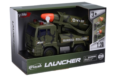 Auto vojenské s raketou. Velikost 19 cm. Na setrvačník. Světelné a zvukové efekty tlačítky na kabině auta. Pohyblivé odpalovací zařícení. 3xAG13 baterie součástí.