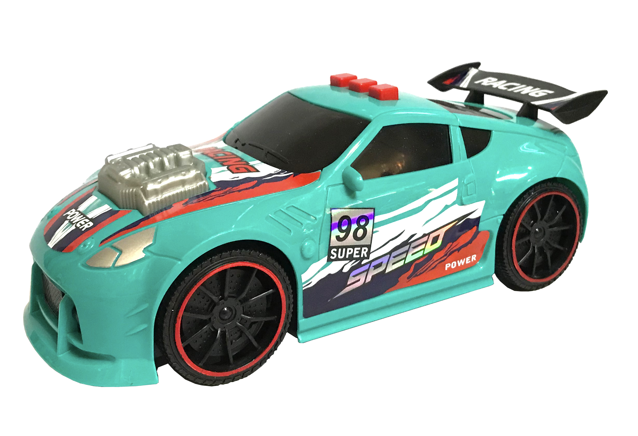 Auto závodní s efekty. Velikost 21 cm. Vydává světelné a zvukové efekty. Aktivace tlačítky na střeše. Levé tlačítko - zvuk motoru, pohyb dopředu a po krátké pauze pohyb dozadu. Prostřední tlačítko - zvuk troubení. Pravé tlačítko - hudba. Baterie 3xAA (1,5V), nejsou součástí.