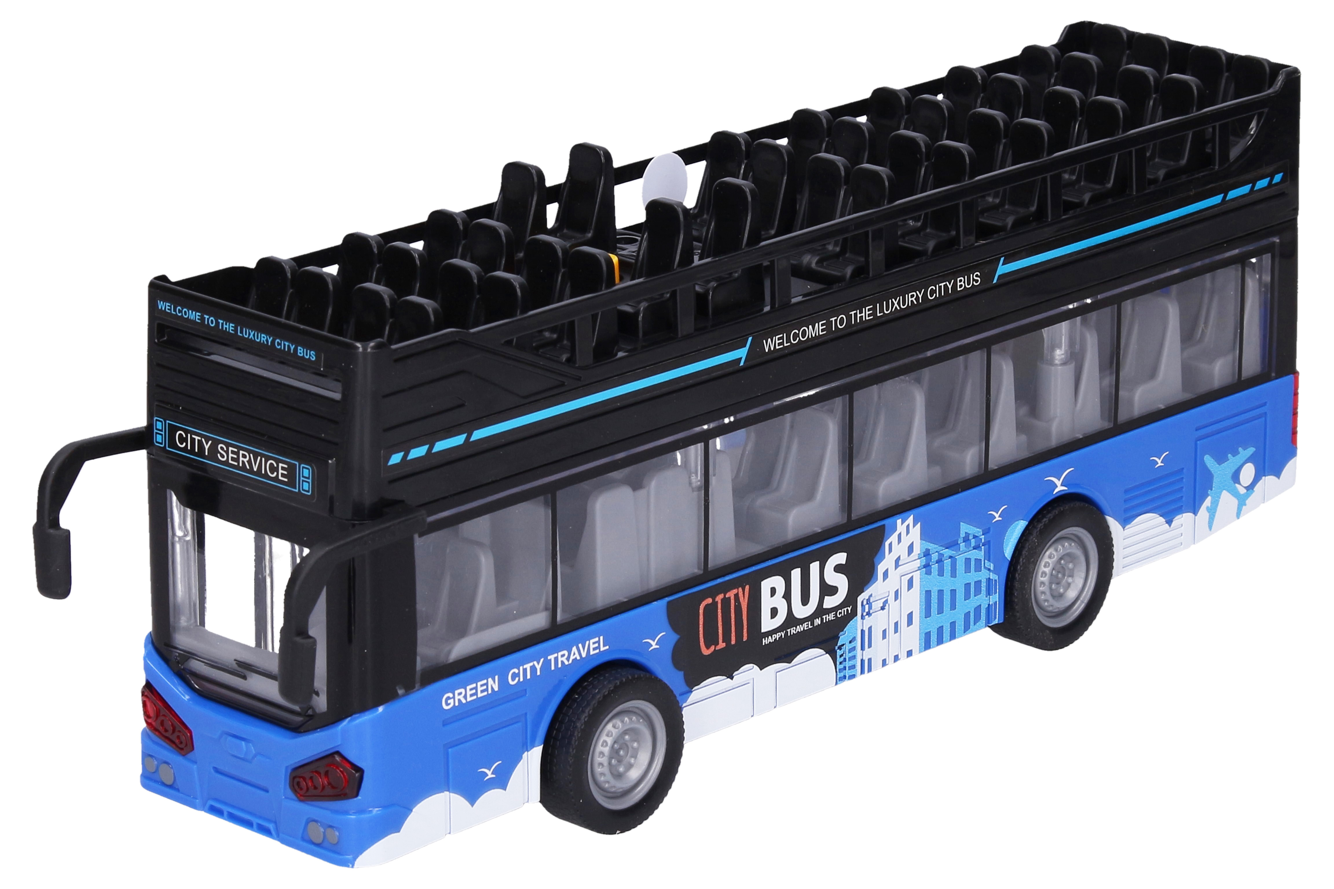 Autobus dvoupatrový vyhlídkový s efekty. Rozměry 28,5x6,5x12 cm. Na setrvačník. Světelné a zvukové efekty tlačítky na střeše. 3xAG13 baterie součástí. Otevírací dveře kolečky nad okny.