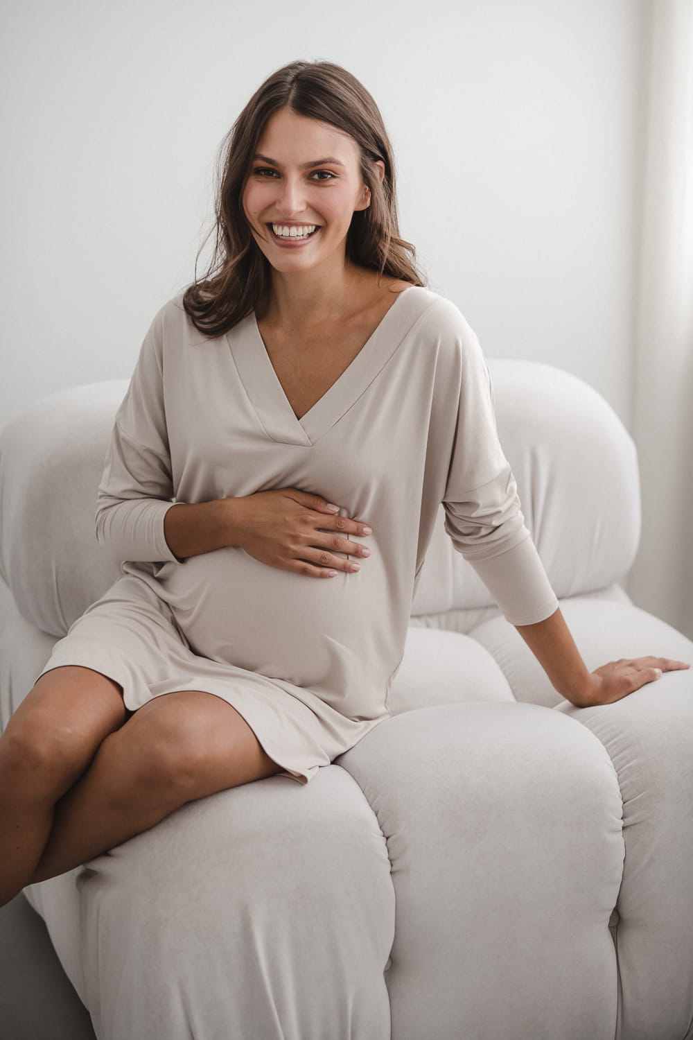 Vhodná dlouhá košile do porodnice, ve které se můžete bez rozpaků procházet po chodbě a krmit své novorozeně po porodu vleže.