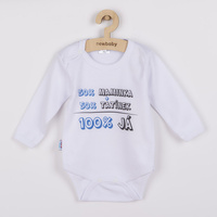 Originální bavlněné kojenecké body s dlouhým rukávem New Baby, s vtipným nápisem 50% MAMINKA + 50% TATÍNEK - 100% JÁ. Body má kolem krčku, nožiček a ručiček barevné lemování. Barvy použité k potisku jsou certifikované a vhodné pro miminka. Je vyrobeno z příjemného a kvalitního materiálu, ve kterém se bude Vaše miminko cítit příjemně. Body má zapínáni na cvočky na ramínku a mezi nožičkami, což usnadňuje oblékání a přebalování. Dopřejte Vašemu miminku vyniknout v originálním body. Složení: 100% bavlna. Rozměry: obvod kolem hrudníku cca 38 cm, délka rukávu cca 21 cm, celková délka cca 33 cm.