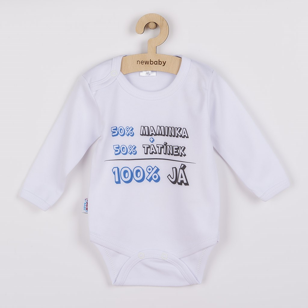 Originální bavlněné kojenecké body s dlouhým rukávem New Baby, s vtipným nápisem 50% MAMINKA + 50% TATÍNEK - 100% JÁ. Body má kolem krčku, nožiček a ručiček barevné lemování. Barvy použité k potisku jsou certifikované a vhodné pro miminka. Je vyrobeno z příjemného a kvalitního materiálu, ve kterém se bude Vaše miminko cítit příjemně. Body má zapínáni na cvočky na ramínku a mezi nožičkami, což usnadňuje oblékání a přebalování. Dopřejte Vašemu miminku vyniknout v originálním body. Složení: 100% bavlna. Rozměry: obvod kolem hrudníku cca 40 cm, délka rukávu cca 22 cm, celková délka cca 36 cm.