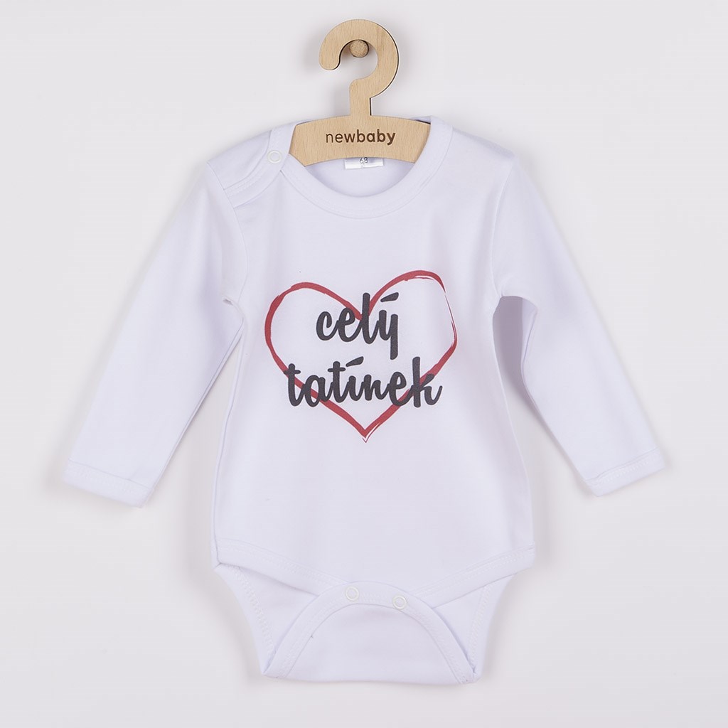 Originální bavlněné kojenecké body s dlouhým rukávem New Baby, s vtipným nápisem celý tatínek. Barvy použité k potisku jsou certifikované a vhodné pro miminka. Je vyrobeno z příjemného a kvalitního materiálu, ve kterém se bude Vaše miminko cítit příjemně. Body má zapínáni na cvočky na ramínku a mezi nožičkami, což usnadňuje oblékání a přebalování. Dopřejte Vašemu miminku vyniknout v originálním body. Složení: 100% bavlna. Rozměry: obvod kolem hrudníku cca 34 cm, délka rukávu cca 16 cm, celková délka cca 30 cm.