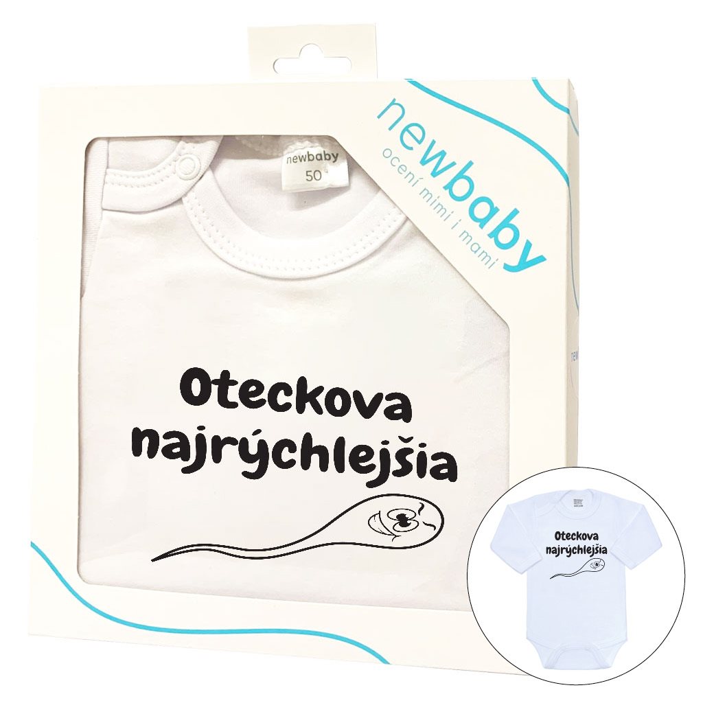 Originální bavlněné kojenecké body s dlouhým rukávem New Baby, s vtipným nápisem OTECKOVA NAJRÝCHLEJŠIA. Barvy použité k potisku jsou certifikované a vhodné pro miminka. Je vyrobeno z příjemného a kvalitního materiálu, ve kterém se bude Vaše miminko cítit příjemně. Body má zapínáni na cvočky na ramínku a mezi nožičkami, což usnadňuje oblékání a přebalování. Dopřejte Vašemu miminku vyniknout v originálním body. Složení: 100% bavlna. Rozměry: obvod kolem hrudníku cca 34 cm, délka rukávu cca 16 cm, celková délka cca 30 cm.