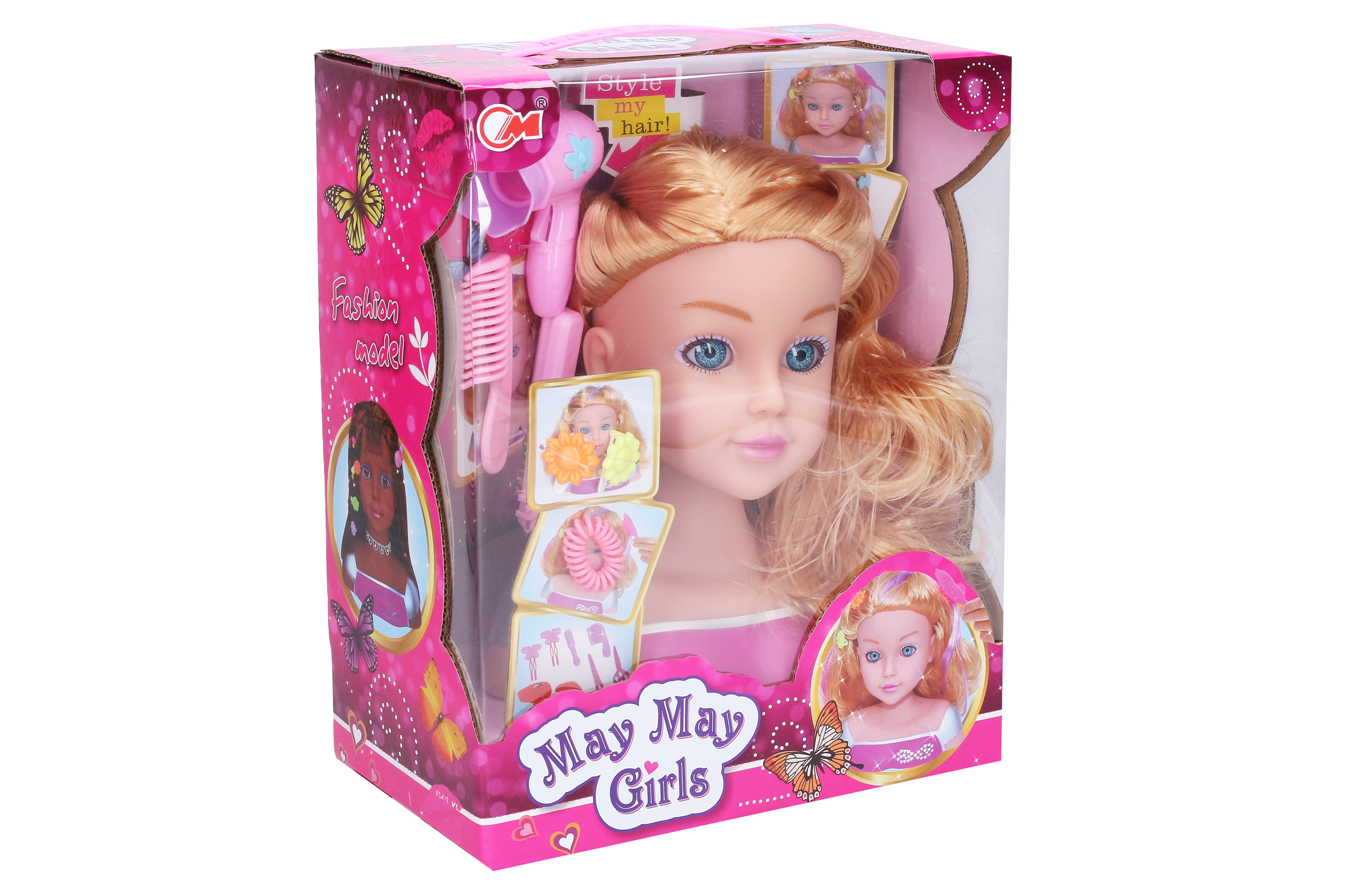 Česací hlava set. Velikost 22 cm. Obsah - hlava, fén, kulma, hřeben, 2 sponky, gumička.
