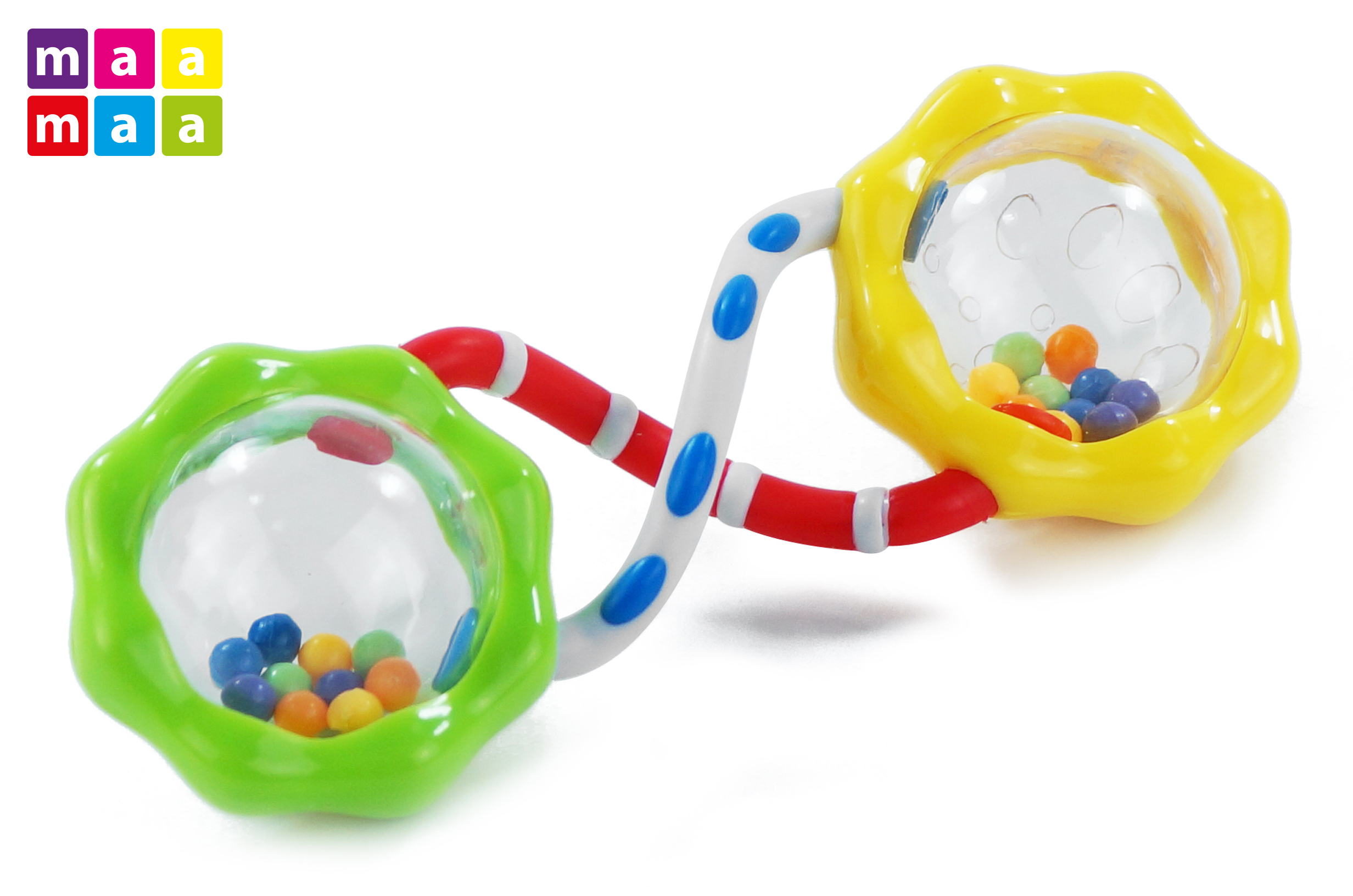 Chrastítko je ve tvaru zajímavé činky. Na obou koncích jsou koule plné menšími pestrobarevnými kuličkami, díky kterým hračka krásně chrastí. 14x5cm