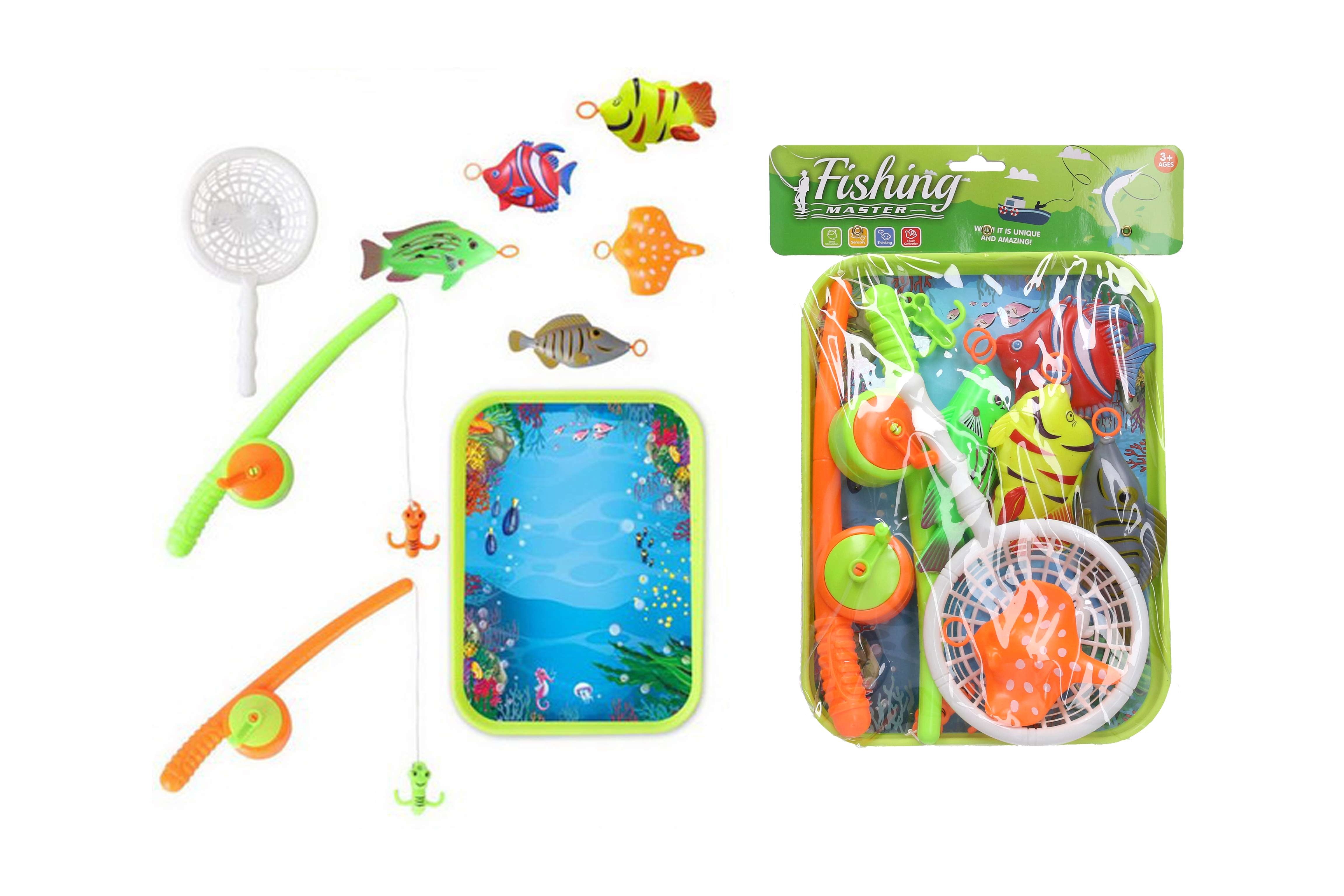 Chytání ryb. Rozměry vodní plochy 27x20x2 cm. Součástí 5 ryb, 2 udice, síto, vodní plocha.
