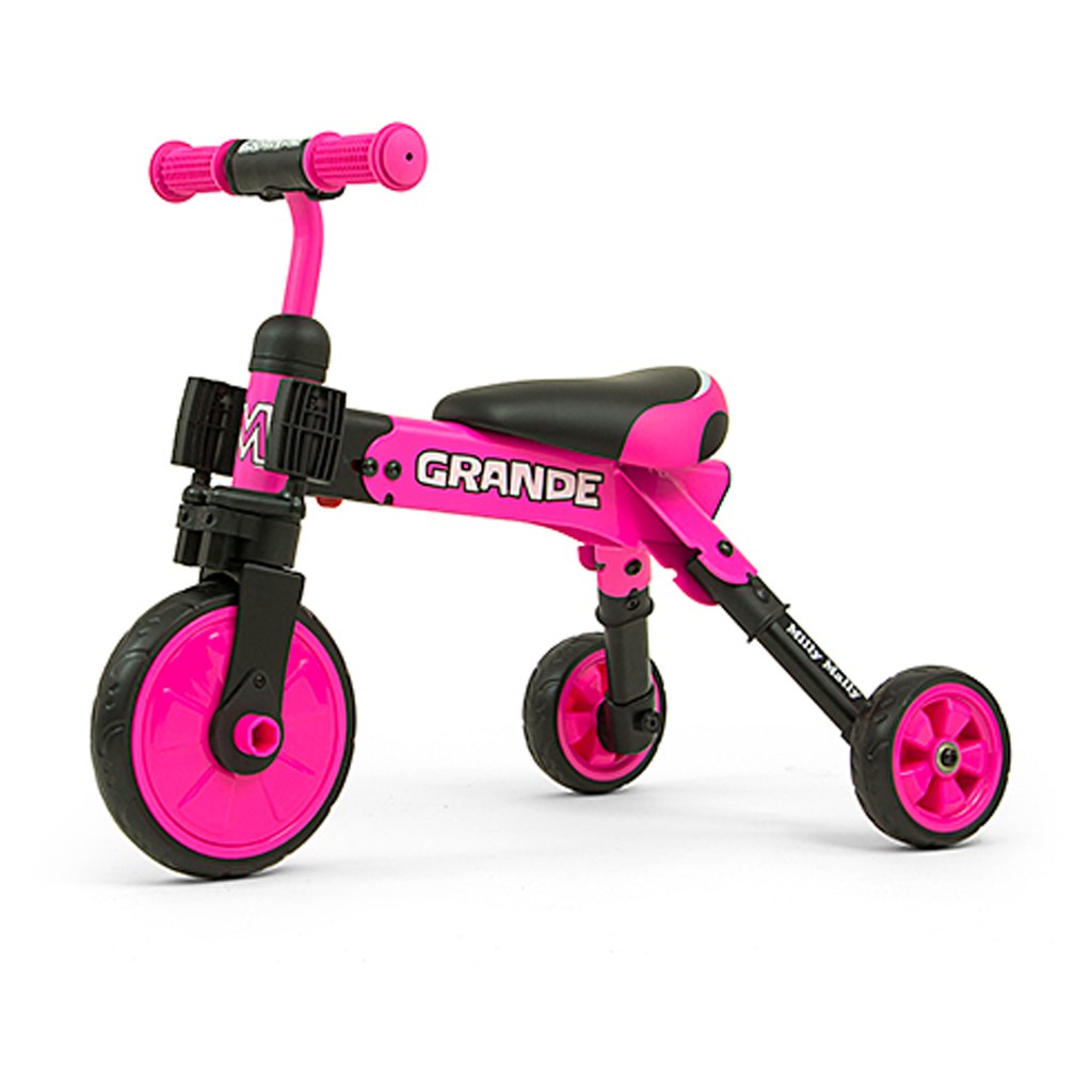 Kompaktní dětská šlapací tříkolka Milly Mally 2v1 Grande je ideálním řešením pro děti, které se právě začínají učí jezdit na kole a přitom ještě nejsou schopné udržet rovnováhu na dvou kolech. Je vyrobena z kvalitních a odolných materiálů a je ideální na procházky. Velkou výhodou této tříkolky je snadná montáž pedálů a nebo snadné složení celé tříkolky. Pěnová kola výborně absorbují rázy, poskytují dobrou přilnavost, zajistí pohodlí během jízdy a neunaví vašeho malého závodníka. Dostatečný rozvor kol poskytuje mimořádnou stabilitu, bezpečnost během používání doma i venku. Měkké a neklouzavé rukojeti zajistí pevné držení řídítek. Doraz nedovolí přetočení řídítek.