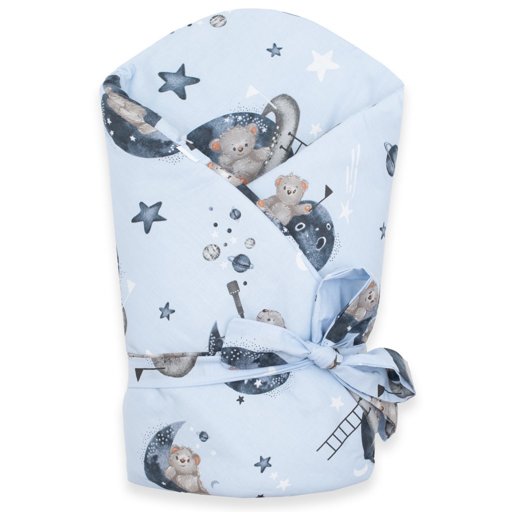 Nádherná dětská zavinovačka české značky New Baby Teddy bear in space pro miminka. Zavinovačka je vyrobena z kvalitního a jemného materiálu, který zaručí vašemu miminku příjemné teplo. Výplň je až 3 cm co znamená, že zavinovačka je vhodná i na chladnější dny a je dostatečně pevná. Krásný dětský motiv, polahodí dětským očičkám. Zapínání na suchý zip i pásek na zavázaní na mašli.