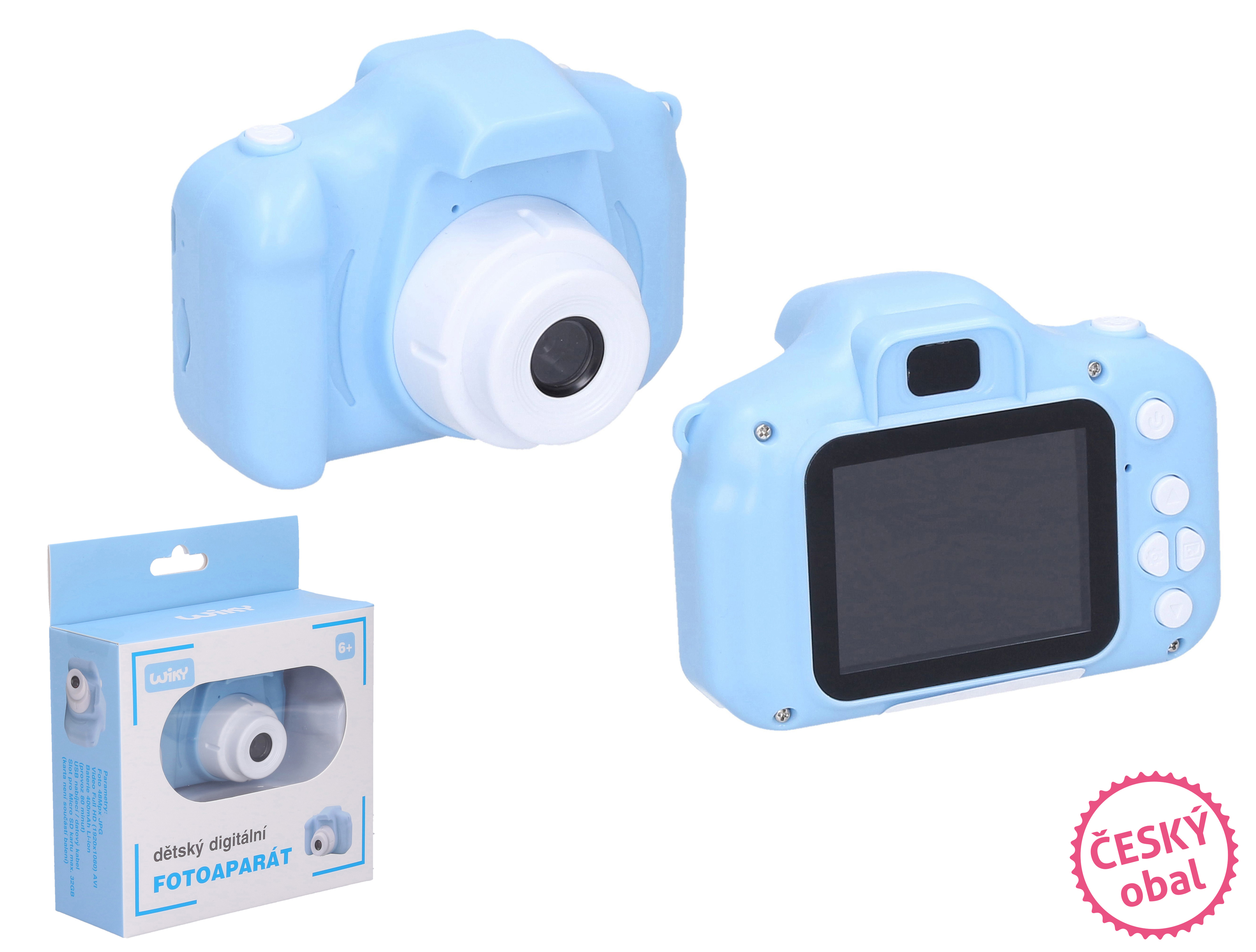 Dětský digitální fotoaparát modrý - foto 48Mpx, video Full HD. Rozměry 8,3x5x6 cm. Rozlišení fotografií 48 megapixelů, videa Full HD (1920x1080). Časovač, vložení času, digitální zoom, různé efekty (rámečky, vložené animace, deformace, filtry) fotografií, hry, mp3 přehrávač, 2,0 palcový displej. Vestavěná 400mAh Li-ion baterie, USB kabel a popruh součástí. Formát fotografií jpg, videa avi. Provoz 80-150 min. Kompatibilní s micro SD kartami - max. 32GB. Paměťová karta není součástí.
