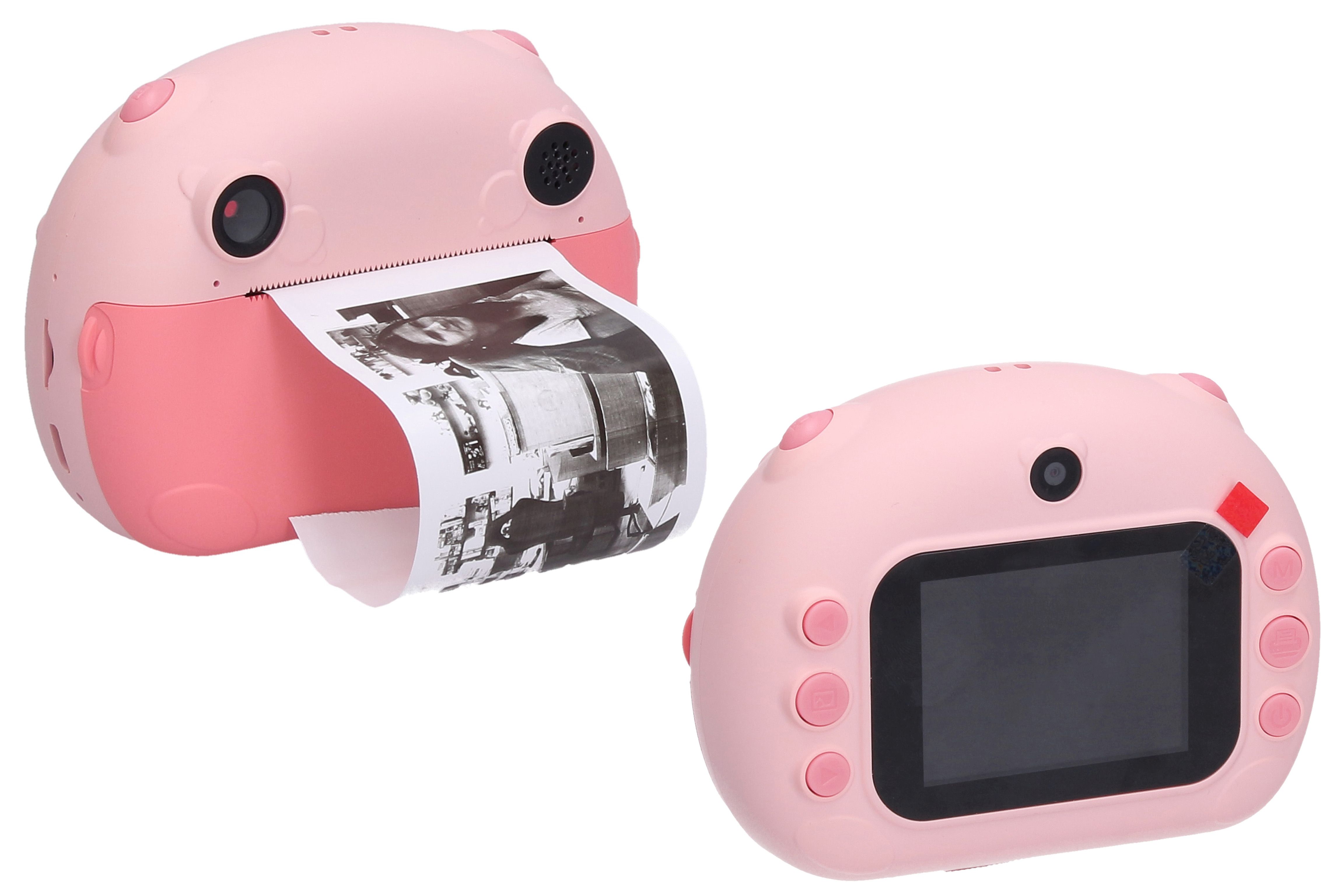 Dětský digitální fotoaparát s tiskárnou růžový - foto 12Mpx, video Full HD. Rozměry 11x4,5x8,5 cm. Rozlišení fotografií 12 megapixelů (4800x2656), videa Full HD (1920x1080). Nastavení kvality tisku. Selfie kamera, časovač, sériové snímání, vložení času, různé efekty (rámečky, vložené animace, filtry) fotografií, hry, mp3 přehrávač, 2,4 palcový displej. Zvlášť tlačítka pro focení, pro natáčení videa, pro tisk fotografií. Vestavěná 750mAh baterie, provoz 180 min, USB kabel součástí. Šířka fotopapíru 5,5 cm, tisknutelná šíře 4,8 cm. 2 role fotopapíru a popruh součástí. Kompatibilní s micro SD kartami - max. 32 GB. Paměťová karta není součástí.