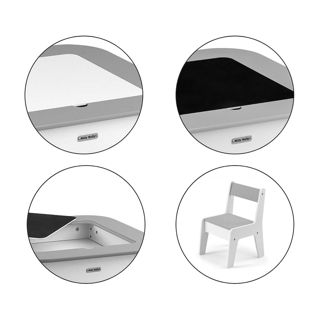 Sada Olaf se vyznačuje jedinečnou deskou – jedna strana vnitřní desky je bílá, zatímco druhá strana je hladká a natřená tabulovou barvou, což je ideální pro kreslení, psaní nebo jiné výtvarné aktivity. Deska je vyjímatelná a pod ní se nachází prostorný úložný prostor, který usnadňuje ukládání hraček, kostek nebo výtvarných potřeb, díky čemuž je udržování pořádku jednodušší.