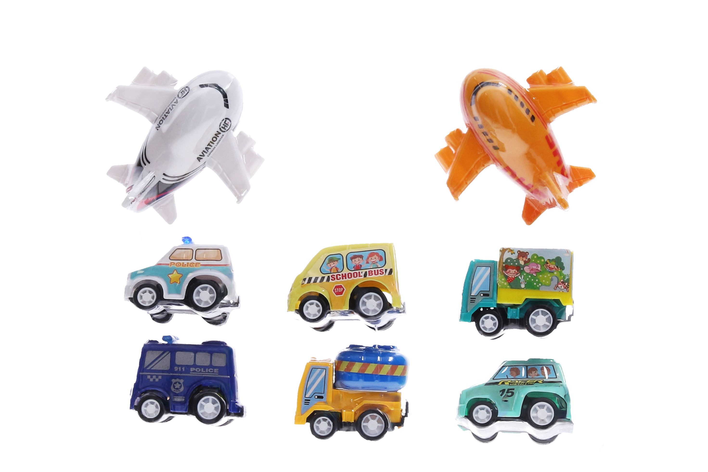Dopravní prostředky 8 ks. Velikost 7 cm. Na zpětné natažení. Obsah balení - 6 autíček a 2 letadla.