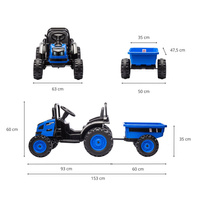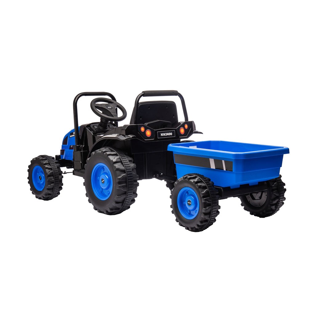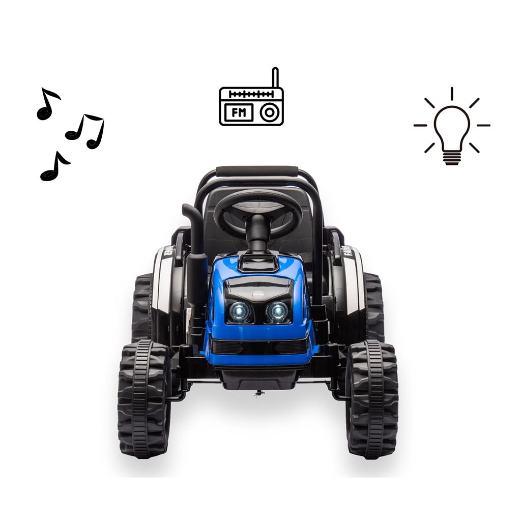 Jedná se o ideální vozidlo pro děti ve věku od 3 do 5 let. Traktor je dodáván s přívěsem pro další zábavu. Kovové bezpečnostní tyče vpředu a vzadu a imitace komína / výfuku, vrčivý zvuk motoru traktoru, to vše umožňuje malým řidičům popustit uzdu své fantazii a cítit se jako skuteční traktoristé. Vypínač aktivuje realistický vrčivý zvuk motoru traktoru, zatímco tlačítko současně vypíná vozidlo. Dva motory umístěné v traktoru dosahují průměrné rychlosti 3-5 km/h.