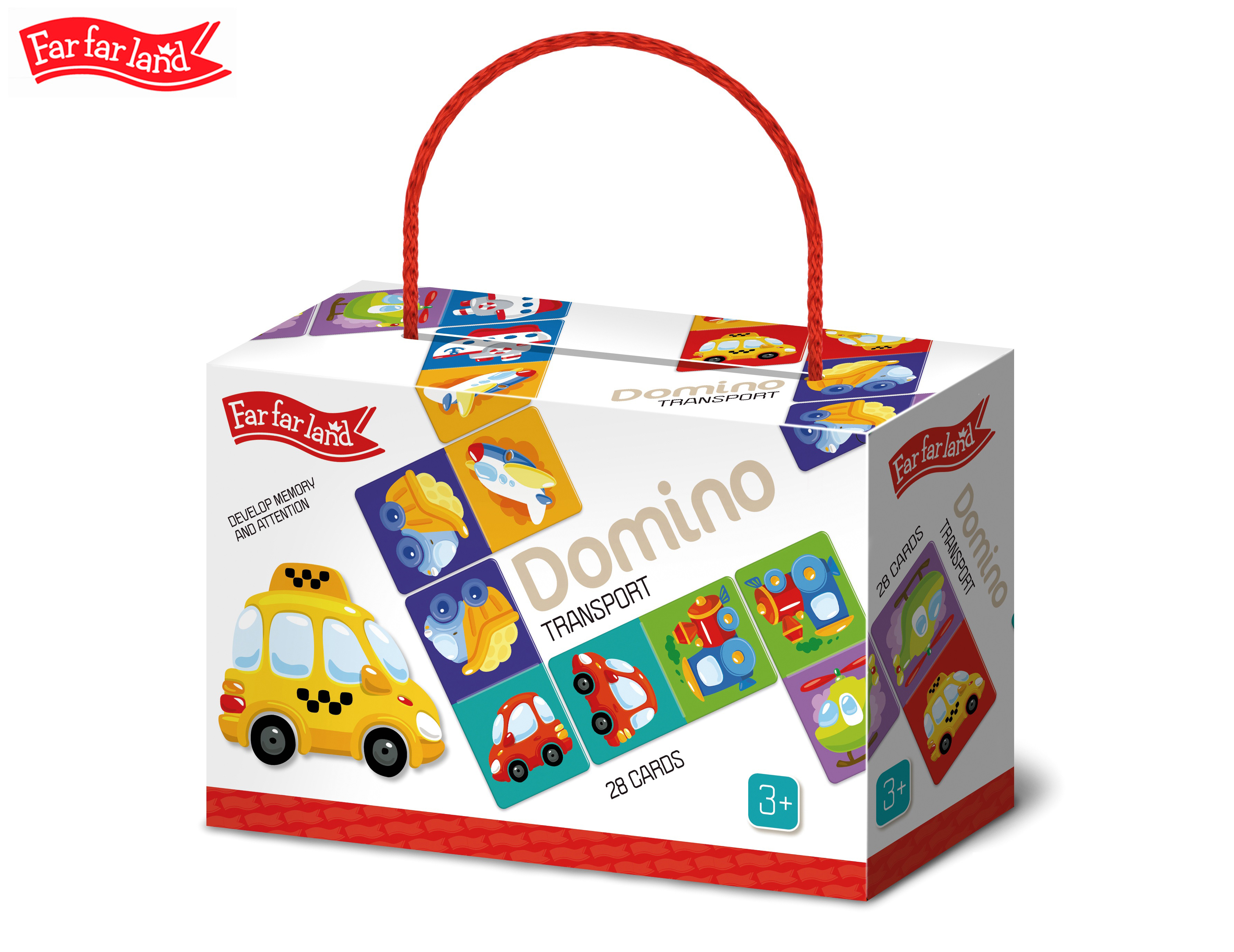 Far Far Land Domino s obrázky doprava. Balení obsahuje 28 karet. Hra pro 2-5 hráčů. Při hře 2 hráčů každý hráč dostane 7 karet. Při hře více hráčů každý dostane 5 karet. Zbývající karty jsou v "banku.“ Hráč, který má "dvojitou" kartu (kartu s totožnými obrázky), hraje první. Pokud žádný z hráčů nemá dvojitou kartu, každý hráč si vezme jednu kartu z banku. Pokud má více hráčů dvojitou kartu, začíná ten mladší. Pro rozehrání prvního tahu si však můžete vymyslet svá vlastní pravidla. Hráči se střídají a jeden za druhým přikládají karty ze své ruky ke kartám na hrací ploše se shodným obrázkem. Pokud hráč nemá shodný obrázek, musí si vzít kartu z banku. Hráč, který položí svou poslední kartu na hrací plochu, vyhrává. Pokud všichni hráči mají v ruce karty, ale není možné hrát dál, hra je ukončena "blokem" a vyhrává hráč, který má v ruce nejmenší množství karet.