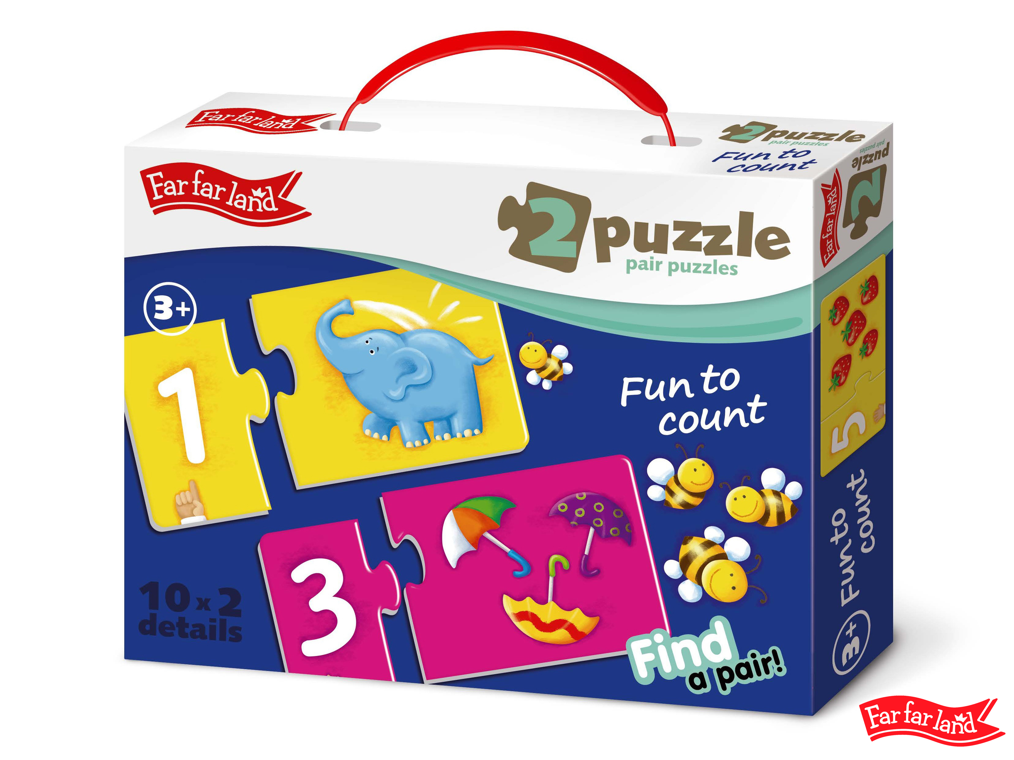 Far Far Land Puzzle párovací. Balení obsahuje 10 puzzle obrázků. Počítání do deseti - každý puzzle obrázek se skládá ze dvou dílků (číslo a obrázek).