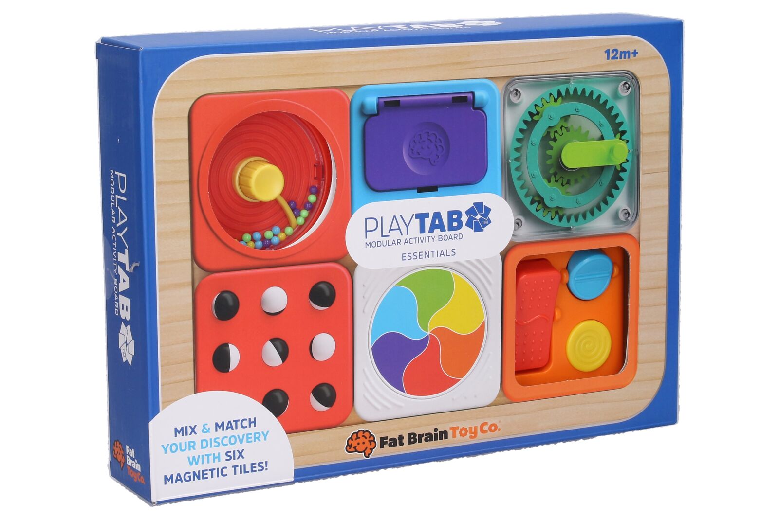 Fat Brain PlayTab Essential senzorické hračky pro nejmenší. Sada senzorických hraček. Rozměr destičky 27x19 cm. S různými tvary a zvuky. S magnetickou podložkou pro snadné uložení a přenášení. Skladá se z několika samostatných hraček. Na cesty si můžete vzít všechny nebo jen jednu. Je možné magneticky připevnit například na lednici.