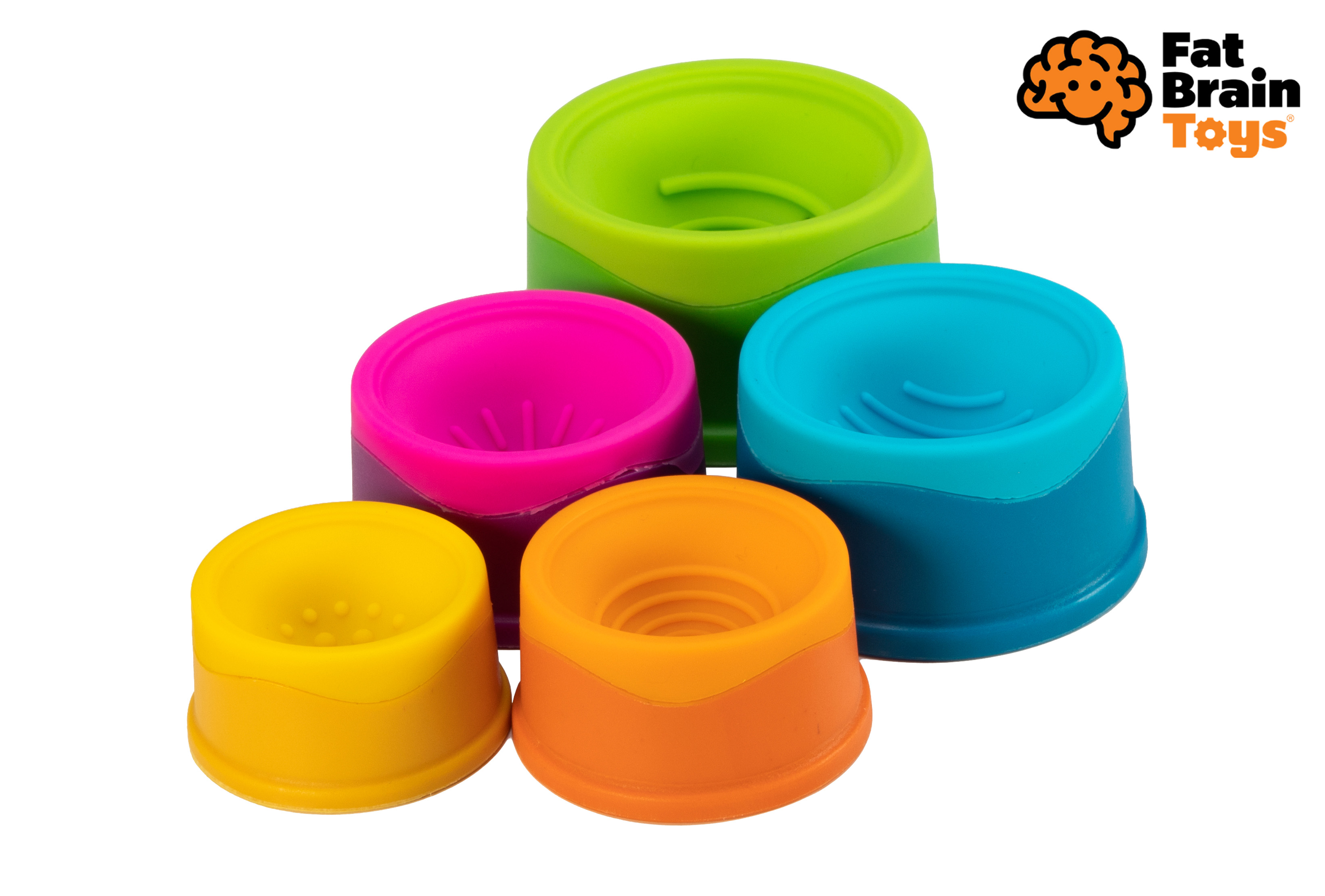 Fat Brain Stohovací kloboučky Dimpl Stack. Balení obsahuje 5 kloboučků. Z měkkého materiálu. Každý klobouček má unikátní barvu a texturu na ohmat.