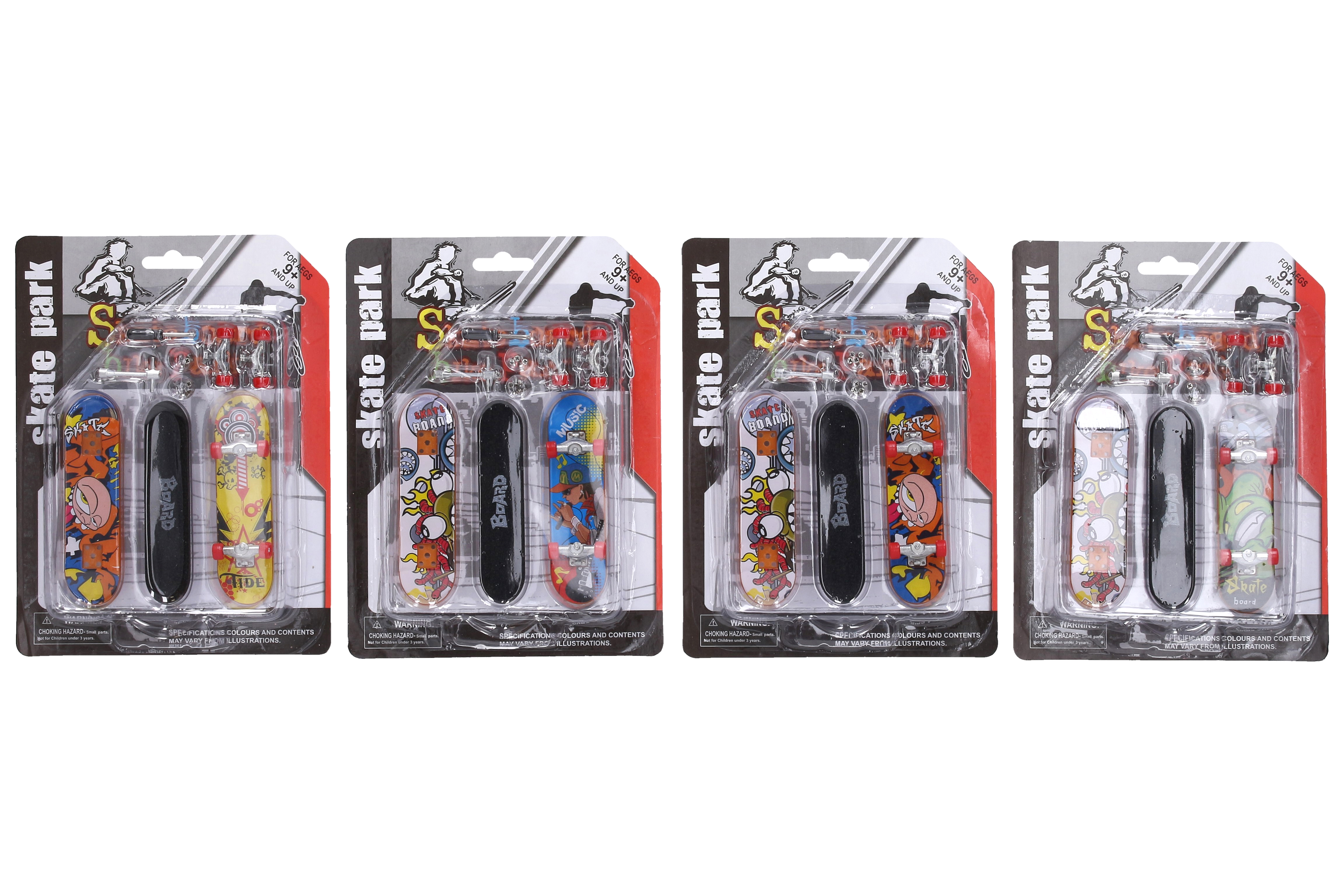 Fingerboard sada s náhradními díly. Délka prkna 9,5 cm. Obsah balení - 1xkompletní fingerboard, 2 náhradní trucky, 8 náhradní šroubků, náhradní prkno, náhradní grip tape, sada šroubováčků na montáž. Více variant.