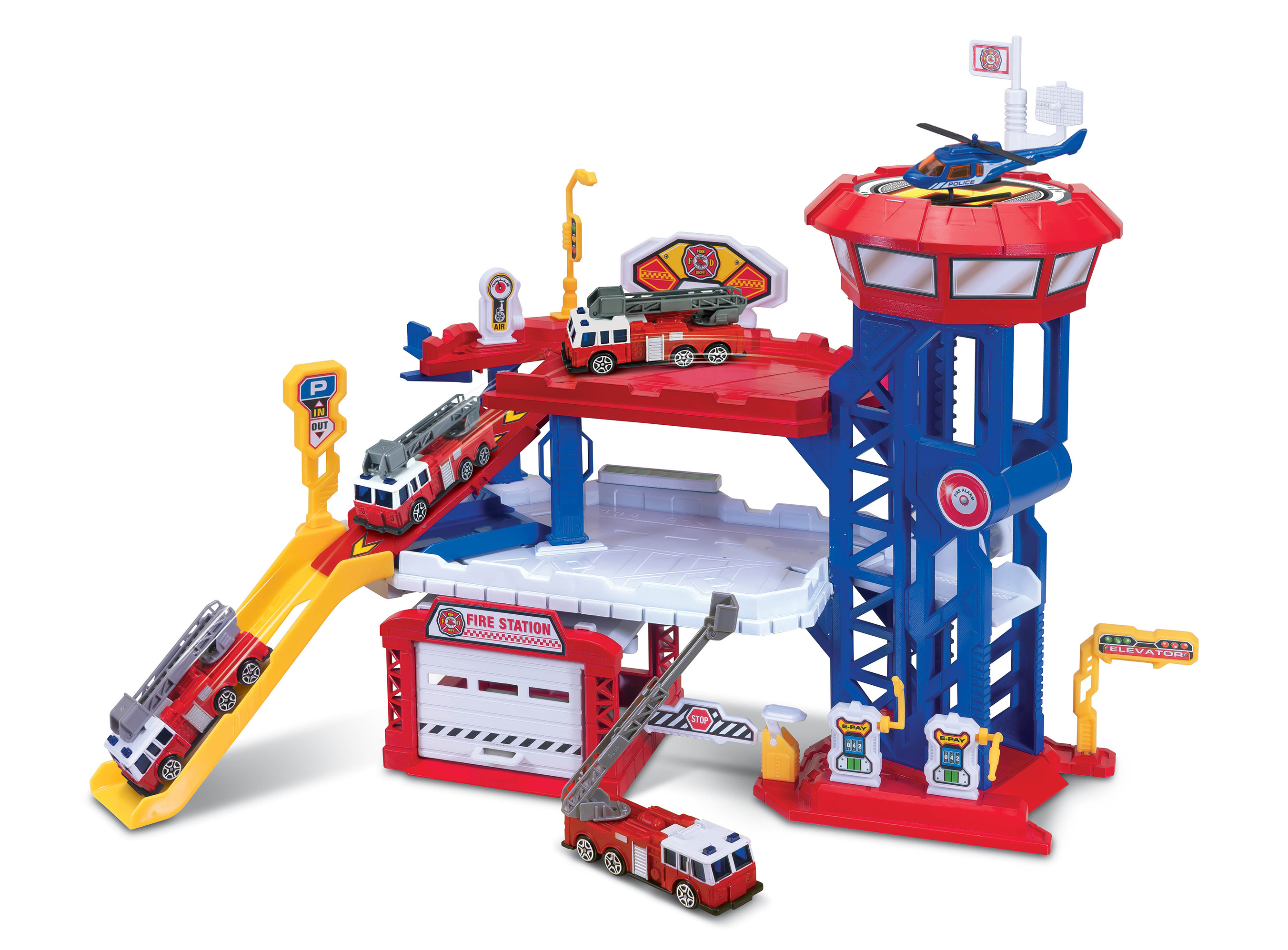 Hasičská stanice garáž. Velikost 38cm. Obsahuje hasičské auto vrtulník., výtah, nájezdy, garáž s vyklápěcími vraty nálepky, obrázkový návod na složení stanice. Garáž má 2 podlaží.