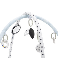 Krásná vzdělávací hrací deka s hrazdičkou rozvíjí dětskou představivost prostřednictvím poznávání barev a tvarů. Měkká podložka s důmyslným designem je lehká a snadno se přenáší. Závěsné hračky: chrastítko, pískátko. Čelenka je odnímatelná, stejně jako hračky. Příjemný a měkký materiál umožňuje pohodlné ležení na břiše nebo na zádech a umožňuje dítěti volný pohyb. podložka je potištěna měsíci, takže rodiče mohou zachytit tyto prchavé okamžiky, jak jejich dítě roste. Vzdělávací podložka poskytuje bezpečný a příjemný prostor a stane se oblíbeným místem pro hraní vašeho dítěte. Rozměry: průměr: cca 89 cm, výška cca 58 cm. Vhodné pro děti od 3 měsíců.