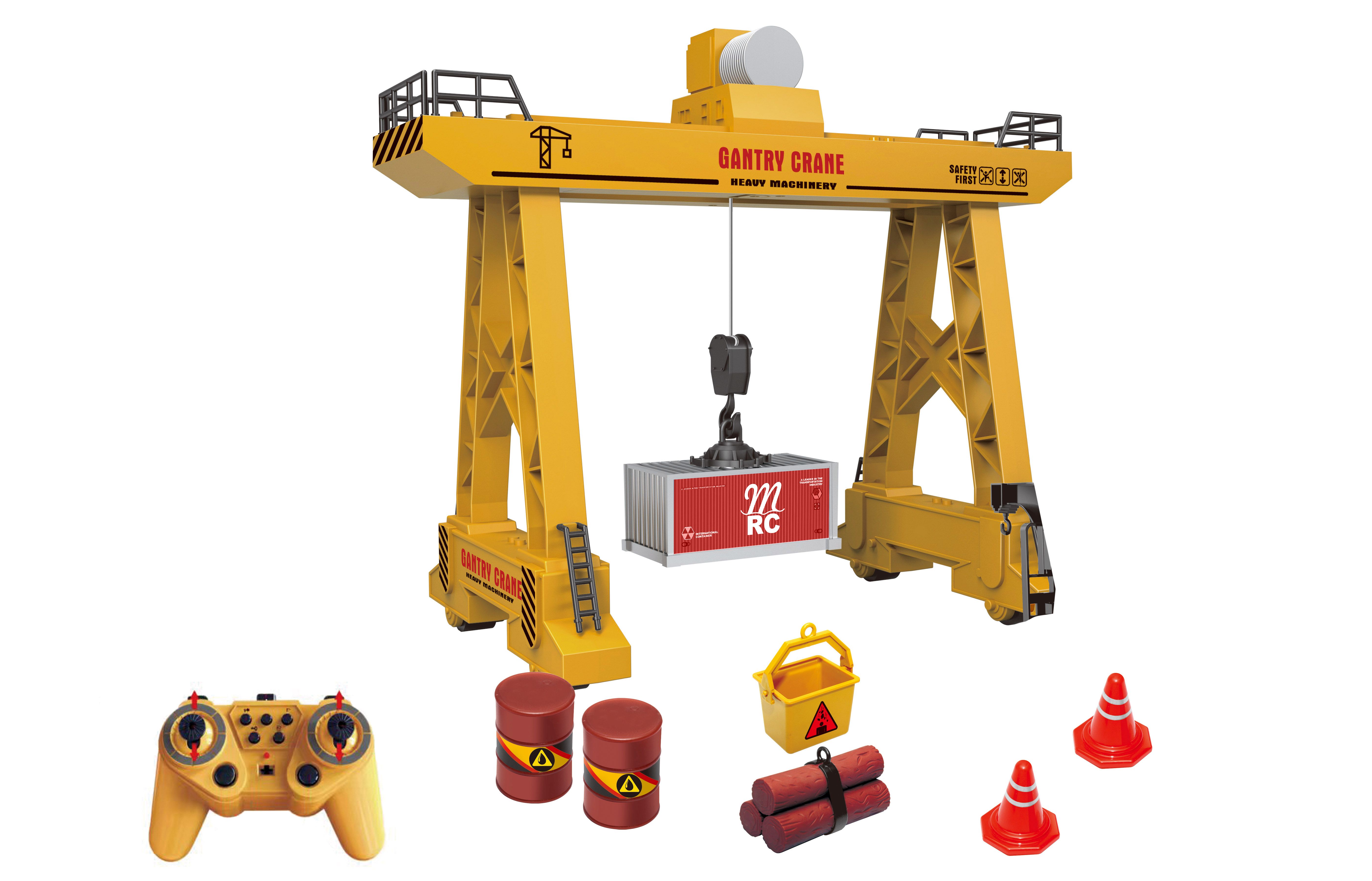 Jeřáb portálový RC na dálkové ovládání. Rozměry 33x17x27 cm. Součástí jeřáb, nabírací nádoba, kontejner, 2 barely, 2 klády, 2 kužely. Frekvence 2.4GHz. Světelné a zvukové efekty. Ovladač - pohyb dopředu, dozadu, otáčení na místě, levé velké tlačítko - zvedání nákladu, pravé velké tlačítko - pokládání nákladu, 5 malých tlačítek - klakson, světlo, zvukové efekty, startování, demo režim. 3.7V bateriový pack do jeřábu součástí, 2xAA do ovladače nejsou součástí. USB kabel součástí. Přepínač ON/OFF jeřábu a na ovladači.