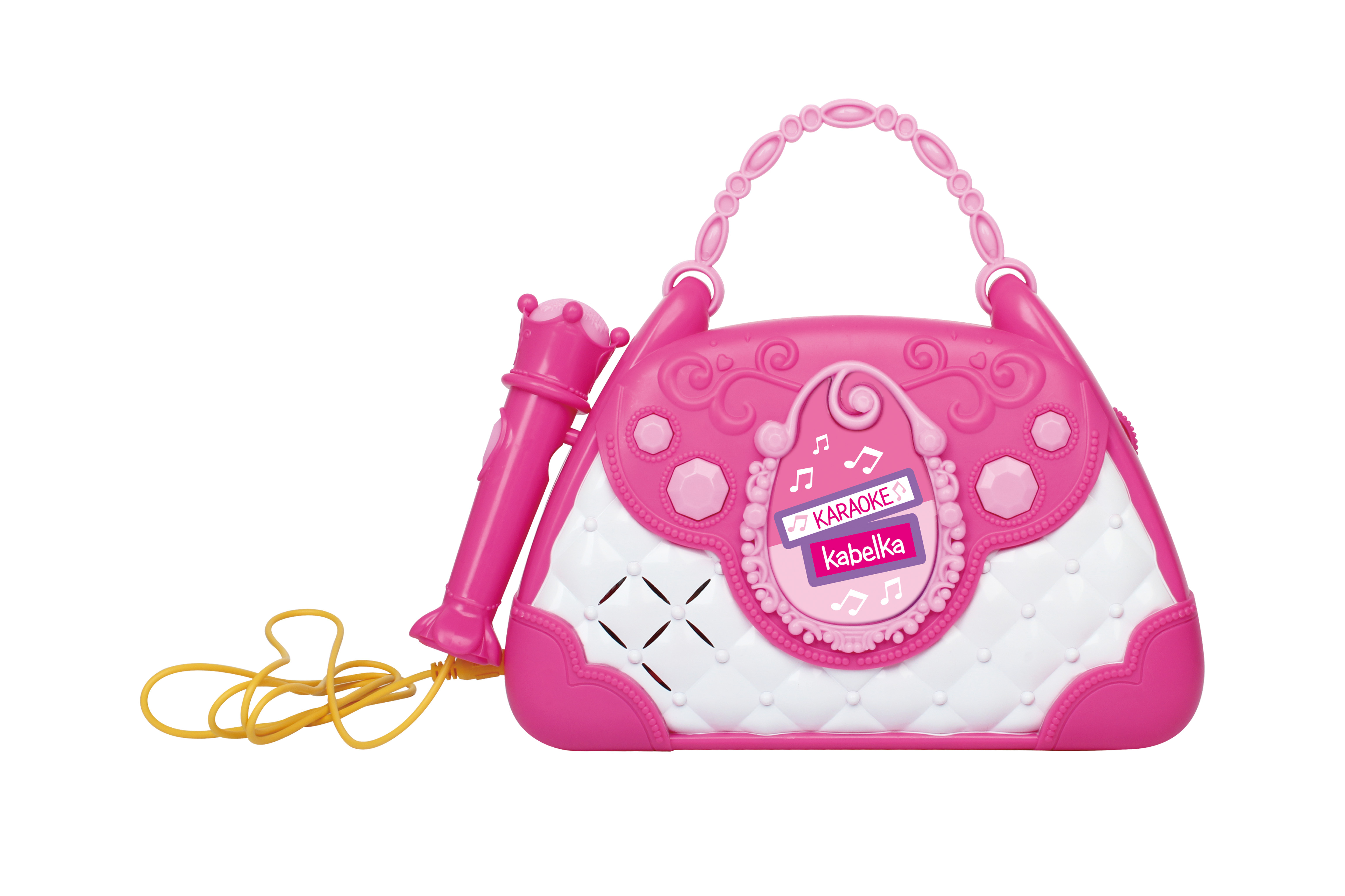 Karaoke kabelka. Světelné a zvukové efekty. Součástí mikrofon, vstup pro telefon a mp3 přehrávač, 2 tlačítka - efekt potlesku, vestavěné melodie. Přepínač ON/OFF. 3xAA baterie nejsou součástí.