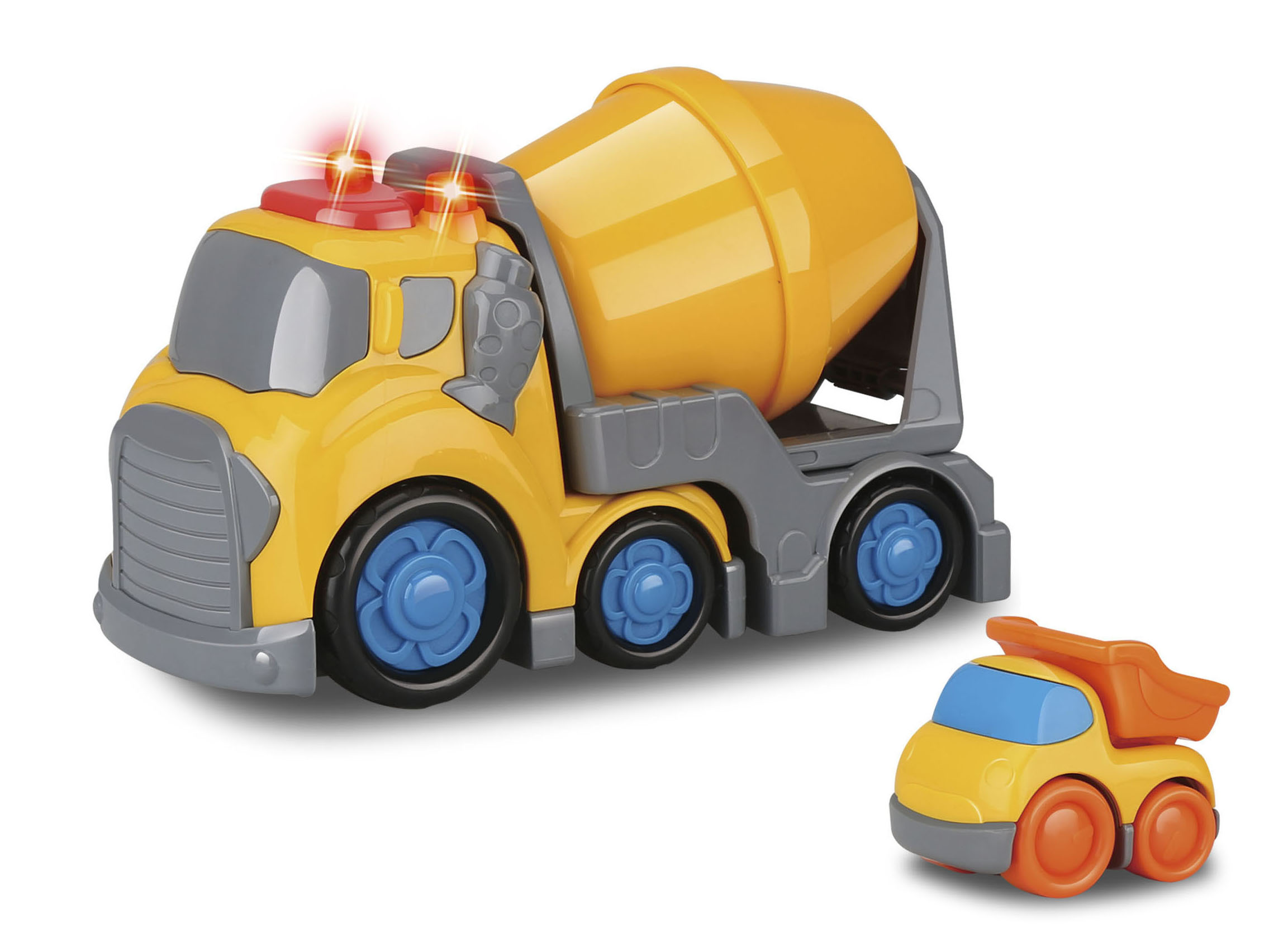 Balení obsahuje auto míchačku s efekty 19,5 cm a malé sklápěcí auto 6,5 cm.