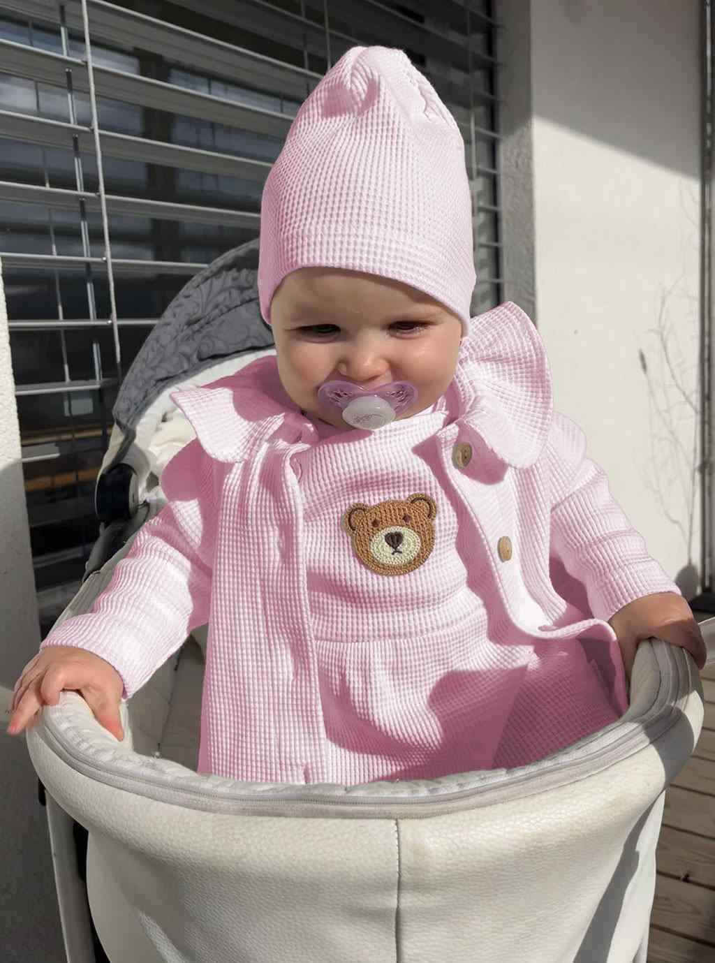 Krásná a stylová čepička české značky New Baby Luxury clothing. Je vyrobena z příjemného materiálu, ve kterém se vaše miminko bude cítit velmi pohodlně. Čepička netlačí a bude dobře držet na hlavičce miminka. Složení 100% bavlna.