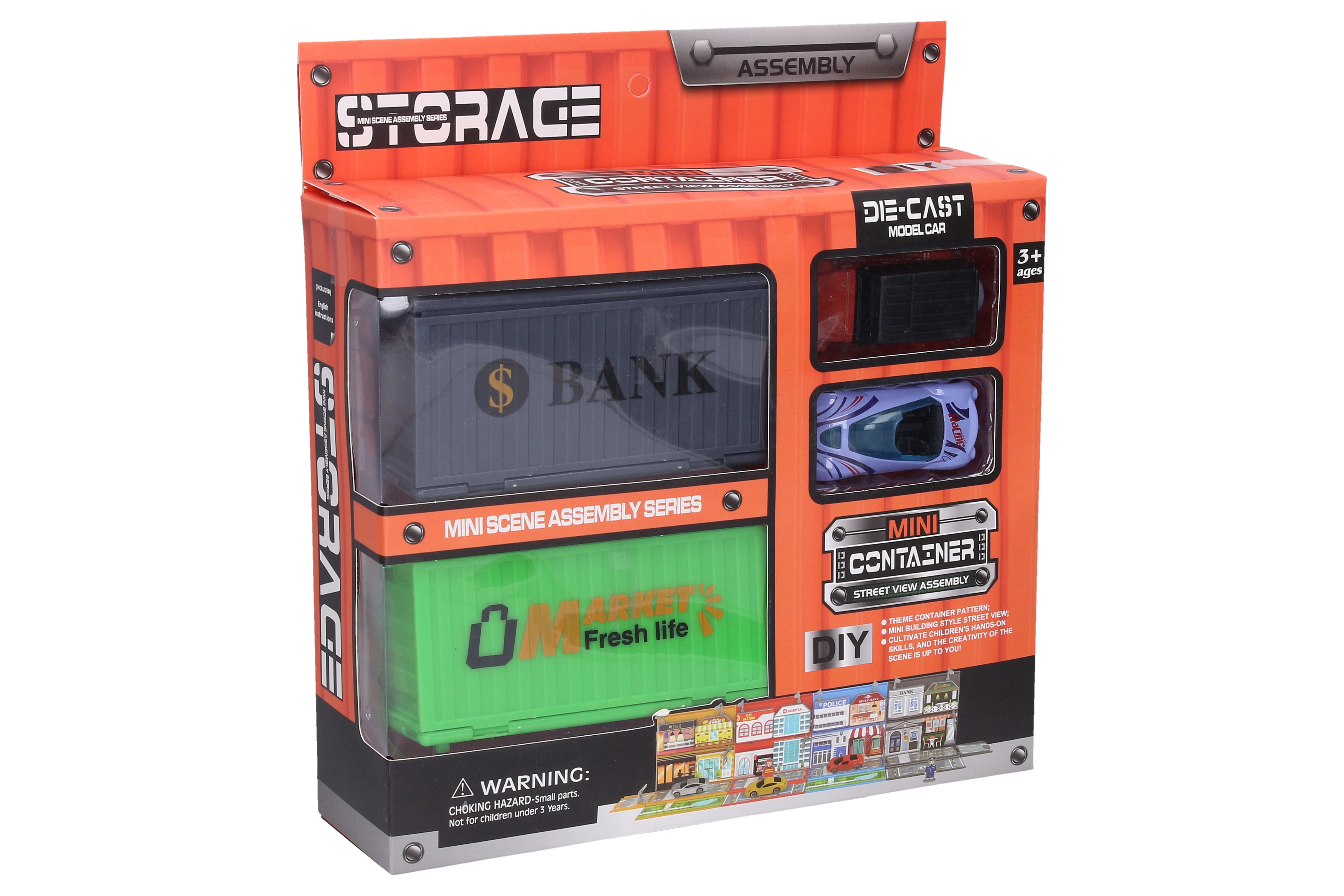 Kontejnerové město - 2 kontejnery. Velikost kontejneru 12,5 cm, auta 7 cm. Obsahuje 2 kontejnery, 2 kovová auta s volnými koly. Každý kontejner obsahuje 1 kovové auto, 2 budovy, 2 pouliční lampy, semafor, ulici, 2 figurky, polepy, obrázkový návod na sestavení. Více variant.