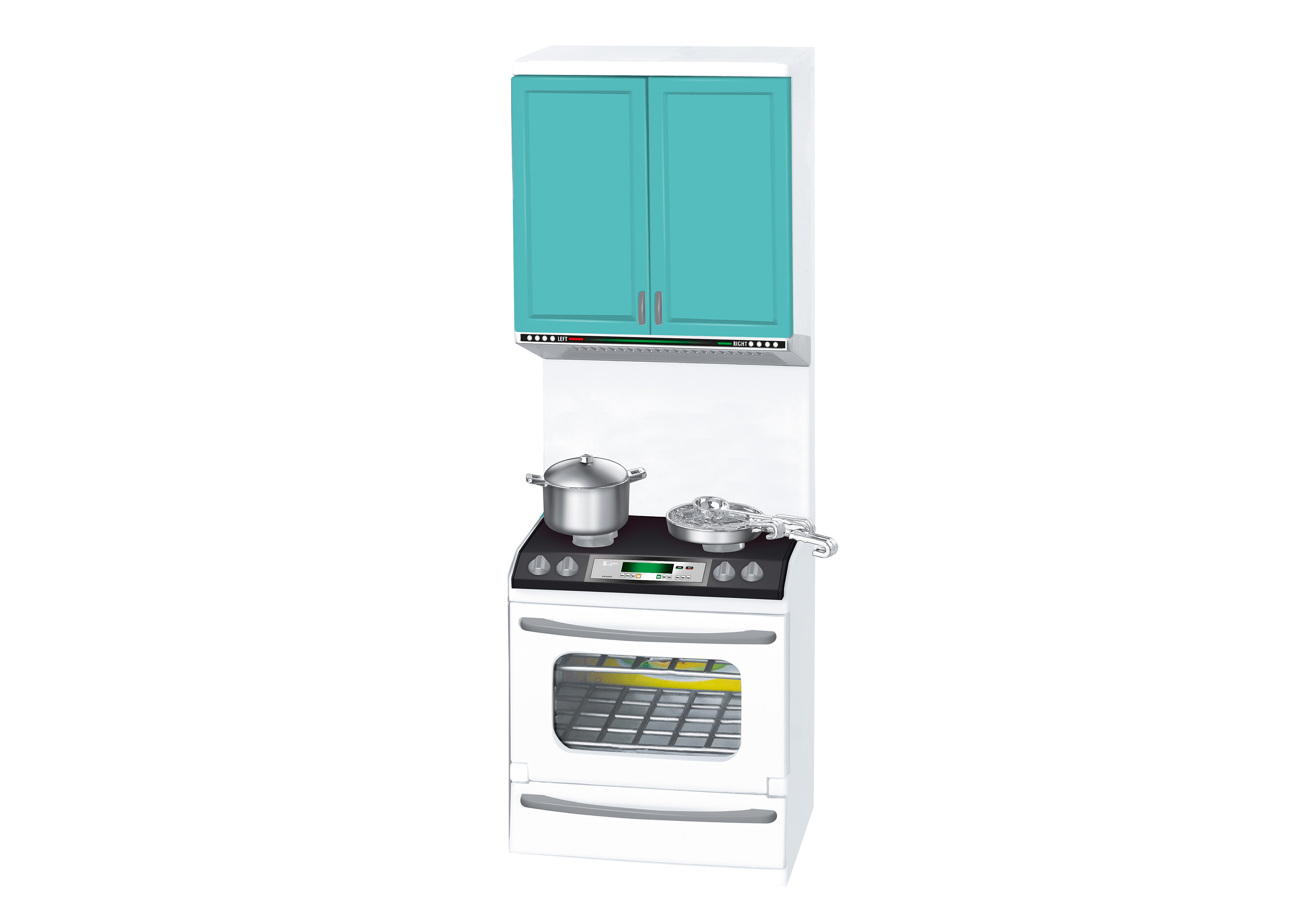 Kuchyňka. Rozměry 10x8x32 cm. Vařič a trouba vydává světelné a zvukové efekty. Efekty se zapínají spínačem na vařiči. 2xAAA baterie součástí.
