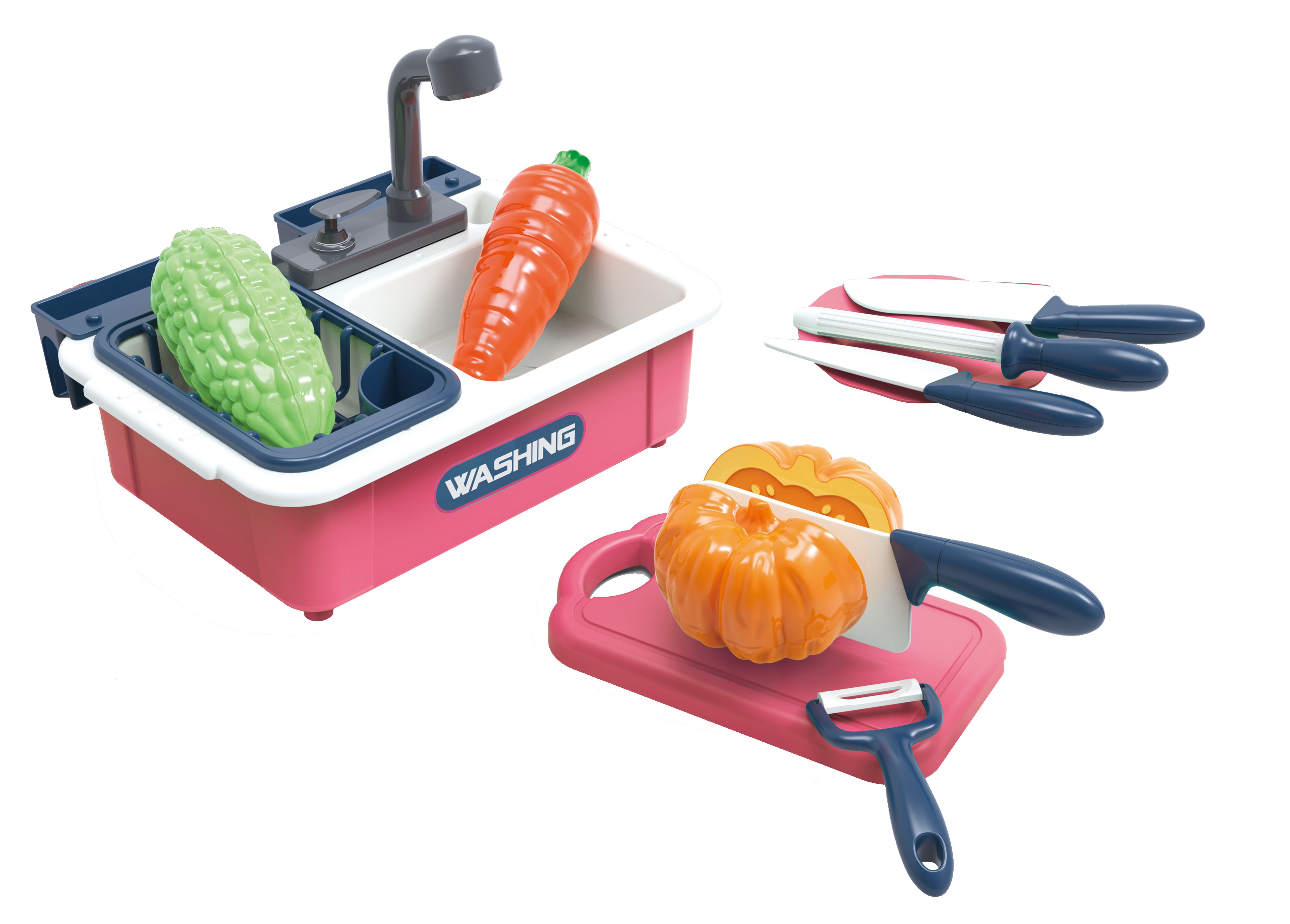 Kuchyňský set. Rozměry dřezu 19x13,5x6 cm. Dřez, odkapávač, 3 nože, brousítko nožů, krájecí prkénko, škrabka, rozkrojitelná mrkev, kukuřice, dýně.