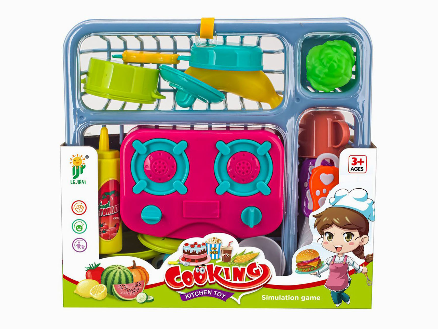 Kuchyňský set. Rozměry 27,5x25,5x7,5 cm. Součástí odkapávač, nádobí, sporák, zelenina (ovoce).