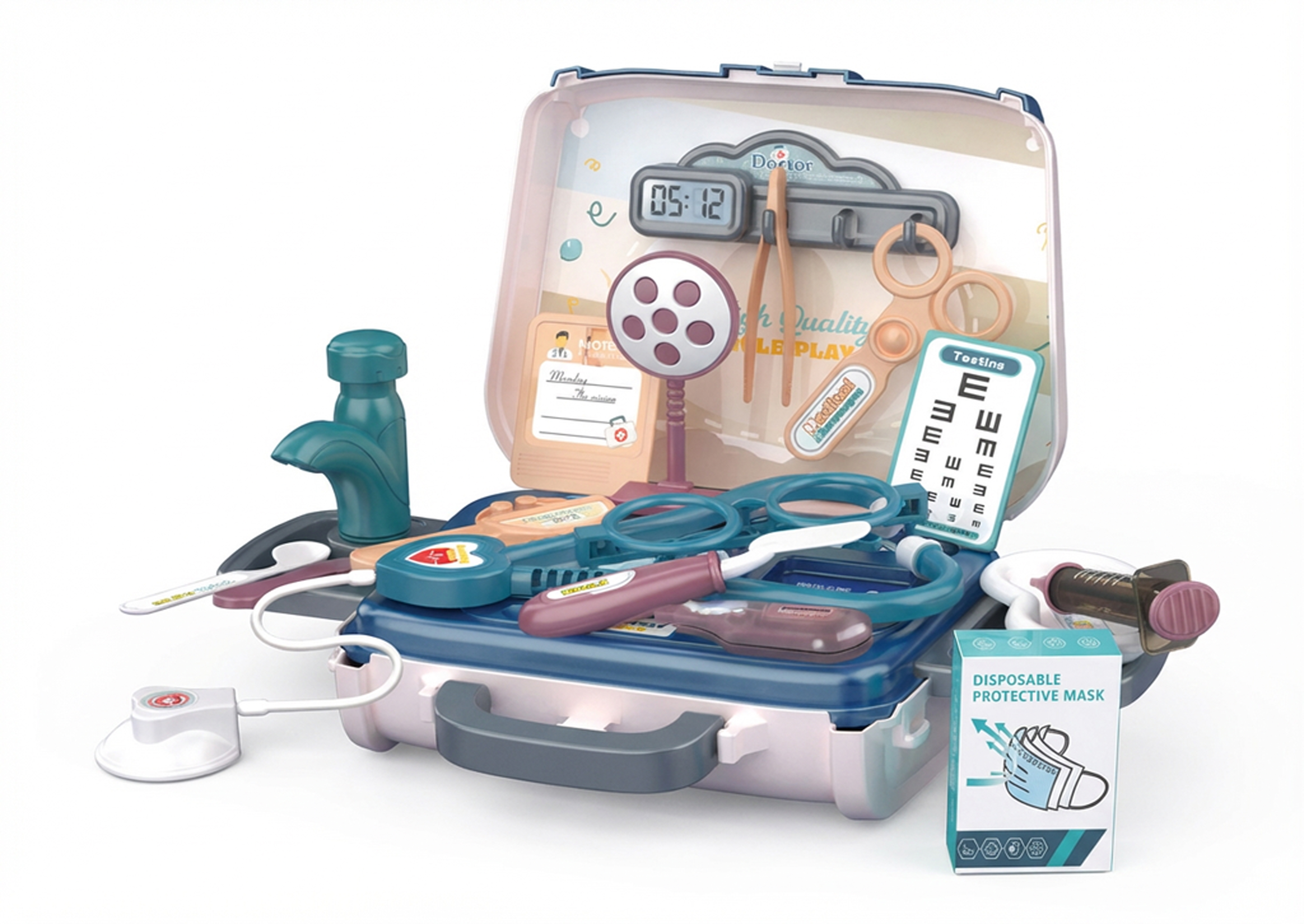 Kufřík doktorský kabelka. Velikost 20 cm. Obsahuje doplňky pro doktora, nálepky na vyzdobení kufříku. Návod na sestavení na obalu. Lze připojit popruh a nosit jako kabelku. Kohoutek nemá funkci tekoucí vody.