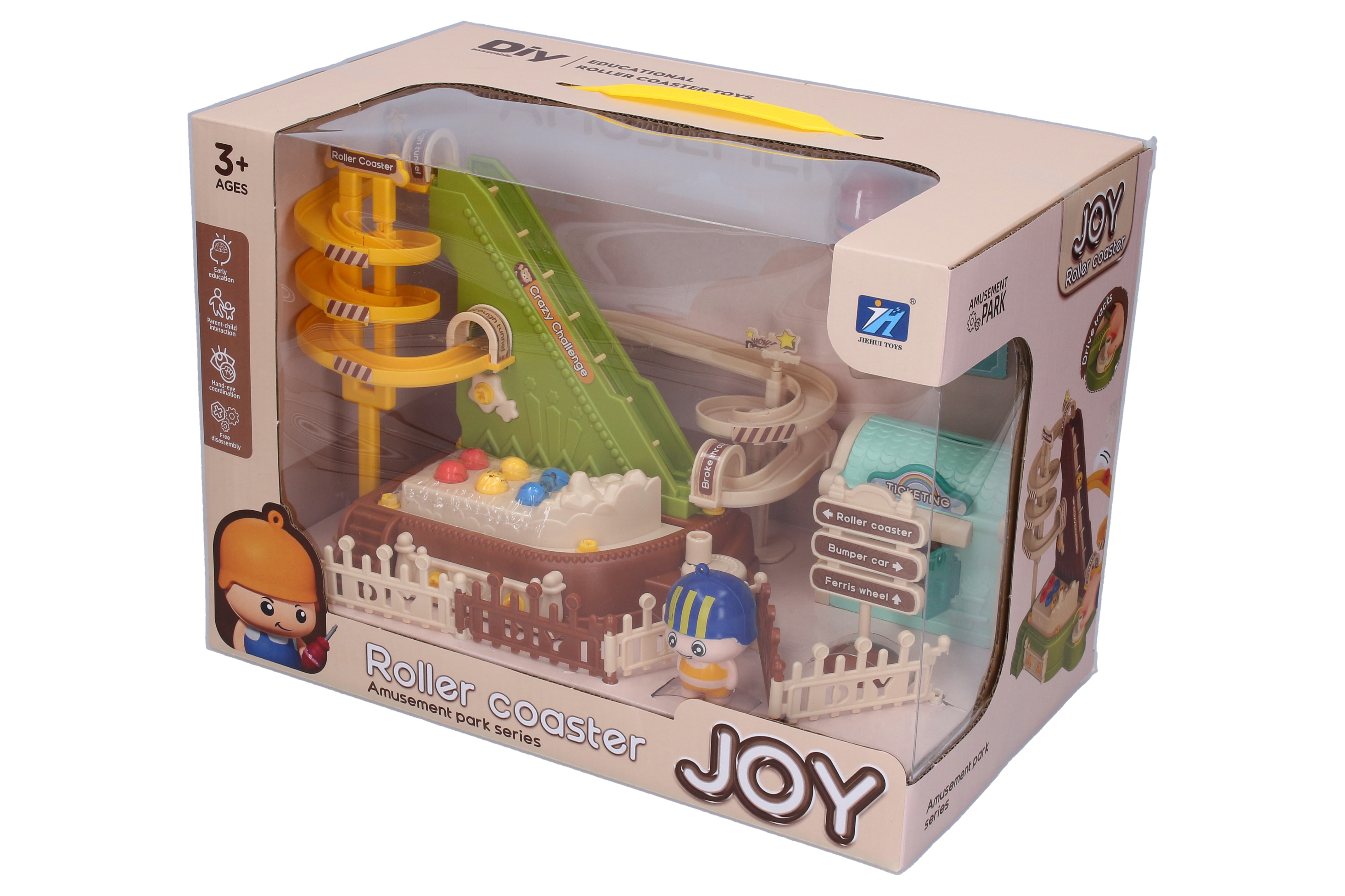 Kuličková dráha šroubovací. Velikost dráhy 18 cm. Obsah balení - šroubovací dráha, 6 kuliček, panáček, ploty, domeček na prodej lístků, šroubovák.