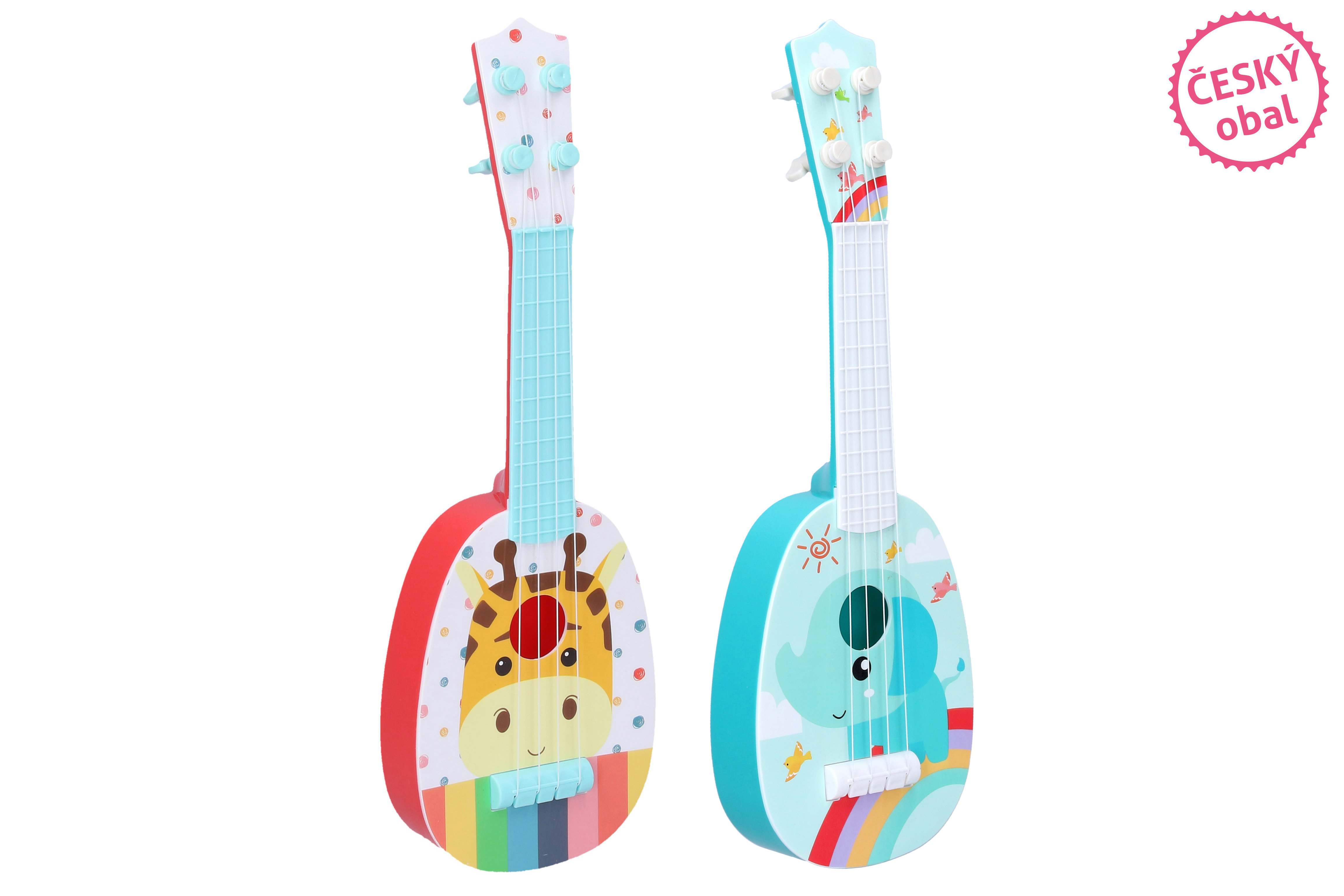 Kytara dětská, motiv africká zvířata. 4 umělé struny. Délka 37 cm. 2 varianty - slon, žirafa.
