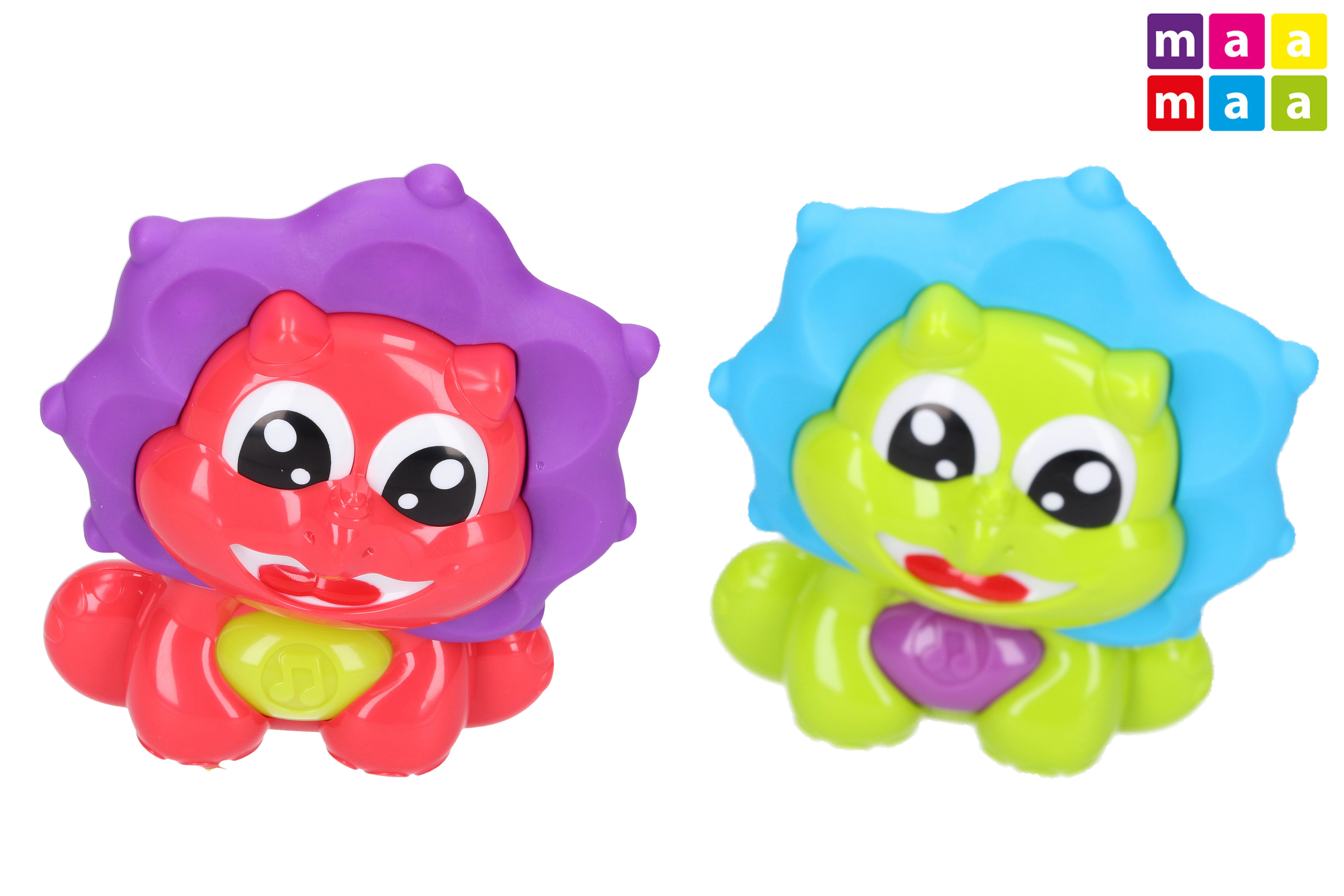 Maamaa Dino. Světelné a zvukové efekty otočením válečku s notou. 3xAG13 baterie součástí. Přepínač ON/OFF na zadní straně. 2 varianty - zelená, červená.