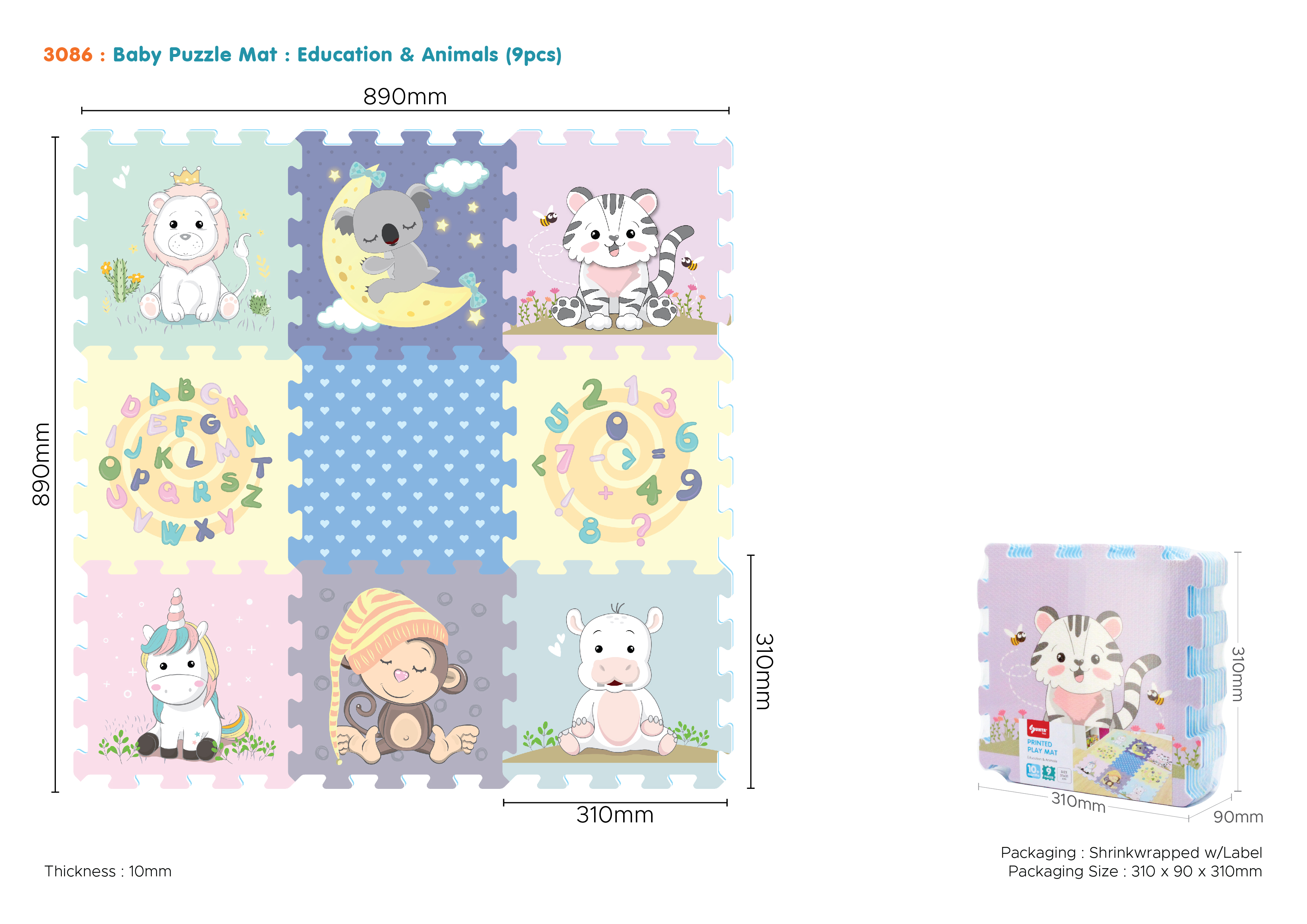 Měkké bloky se zvířátky naučné. Rozměry 1 části 31x31 cm. Balení obsahuje 9 ks. Rozměry při sestavení do čtverce, 89x89 cm.