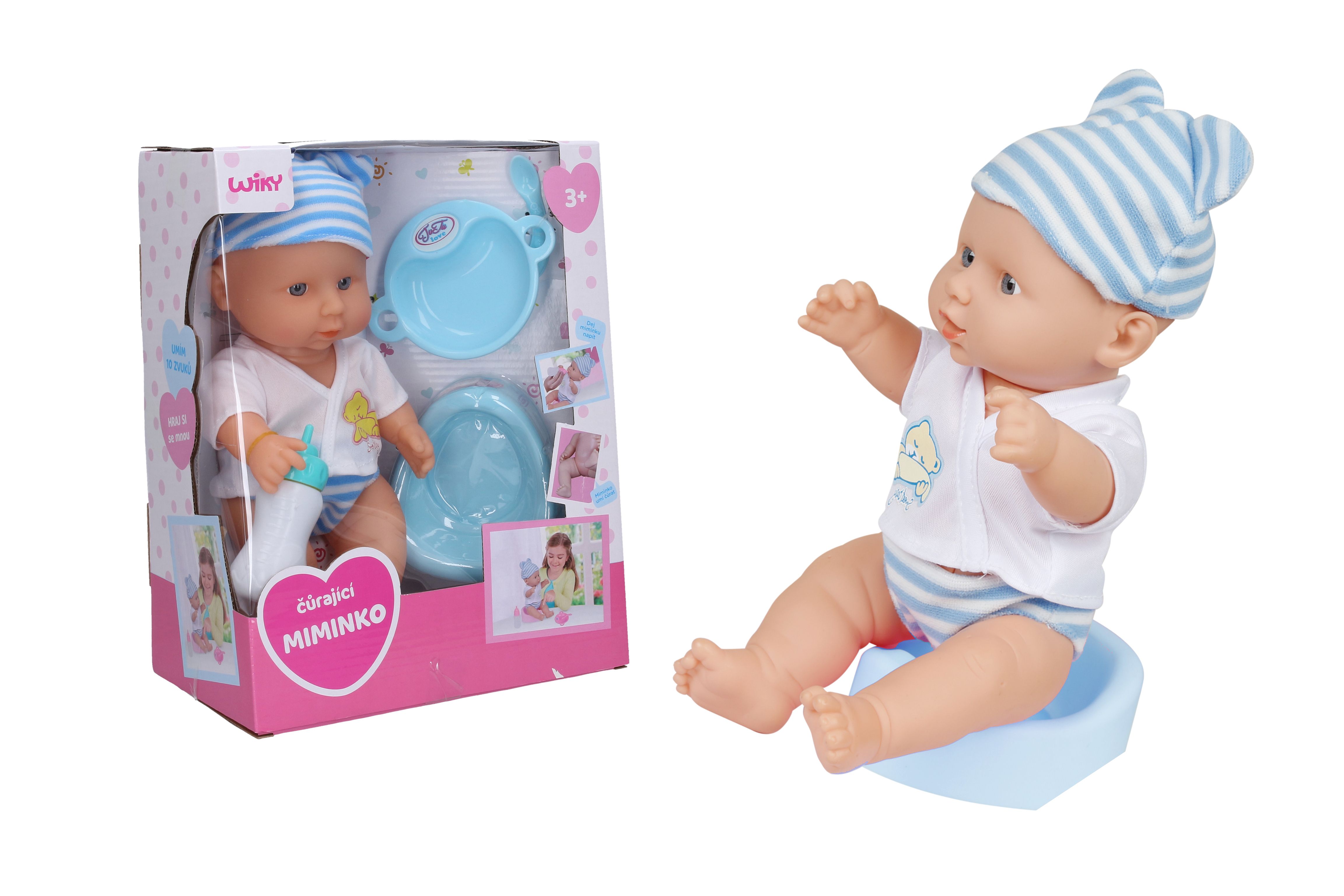 Miminko čurající. Velikost 30 cm. Miminko pije z lahvičky. Obsahuje miminko, lahvičku, nočník, talířek a lžičku. Miminko vydává 10 různých zvuků. 3xAG13 baterie součástí.