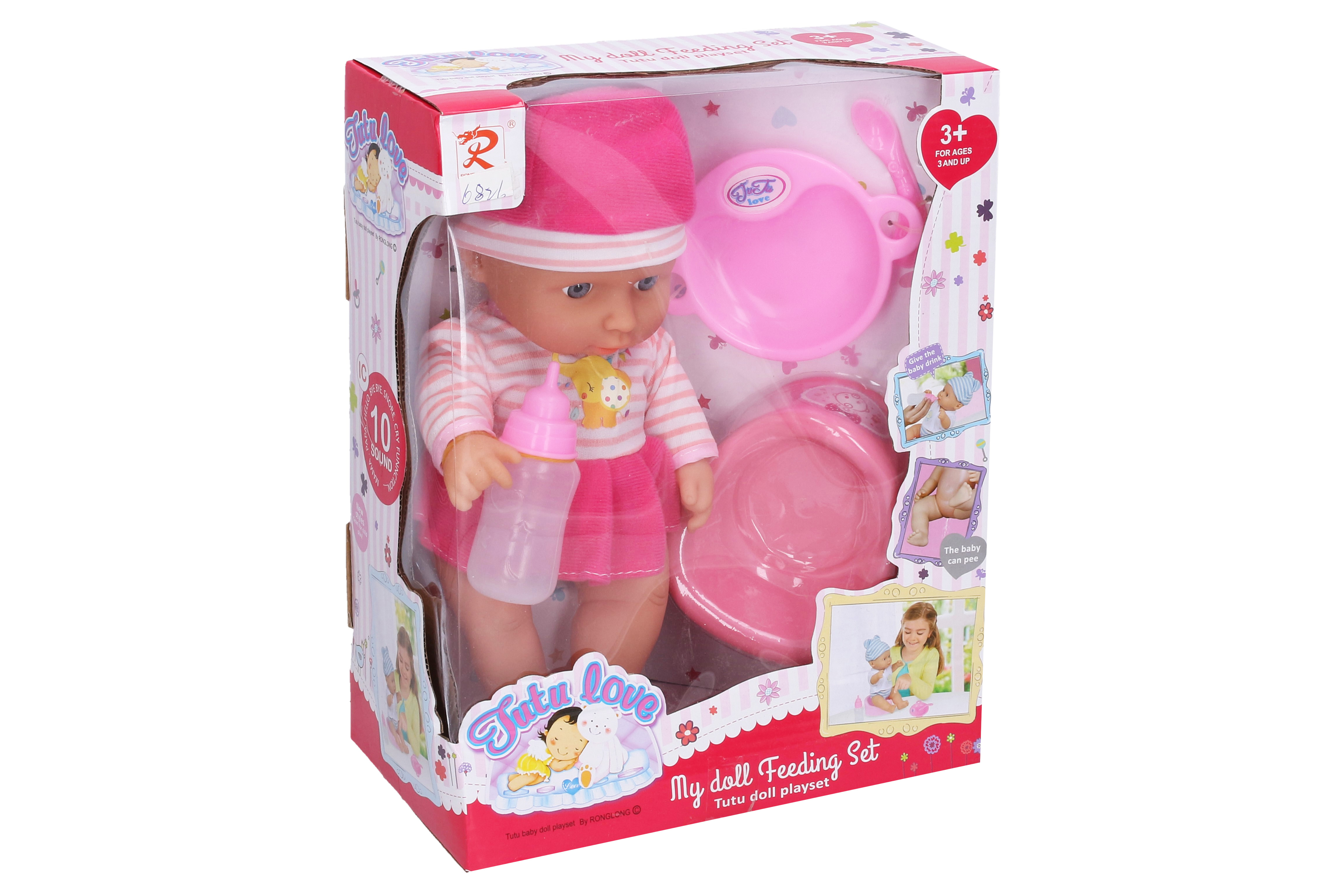 Miminko čurající. Velikost 30cm. Miminko pije z lahvičky. Obsahuje miminko, lahvičku, nočník, talířek a lžičku. Miminko vydává 10 různých zvuků. 3xAG13 baterie součástí.