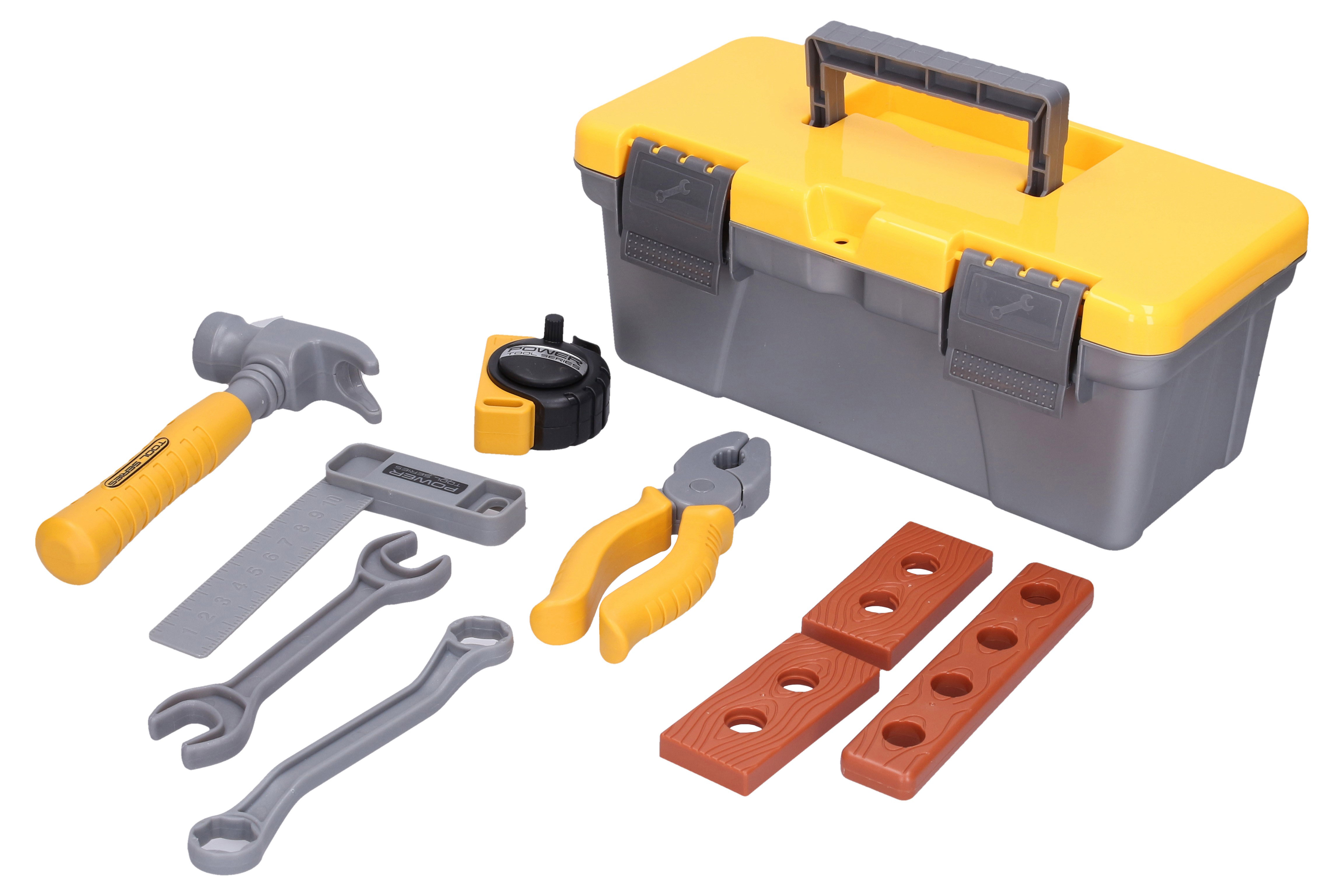 Nářadí v kufříku. Rozměry kufříku 27,5x14x11,5 cm. Obsahuje - kladívko, kombinačky, šroubovák se 3 výměnnými nástavci, 2 klíče, šrouby, matice, dřívka, vrták, úhelník, svinovací metr.