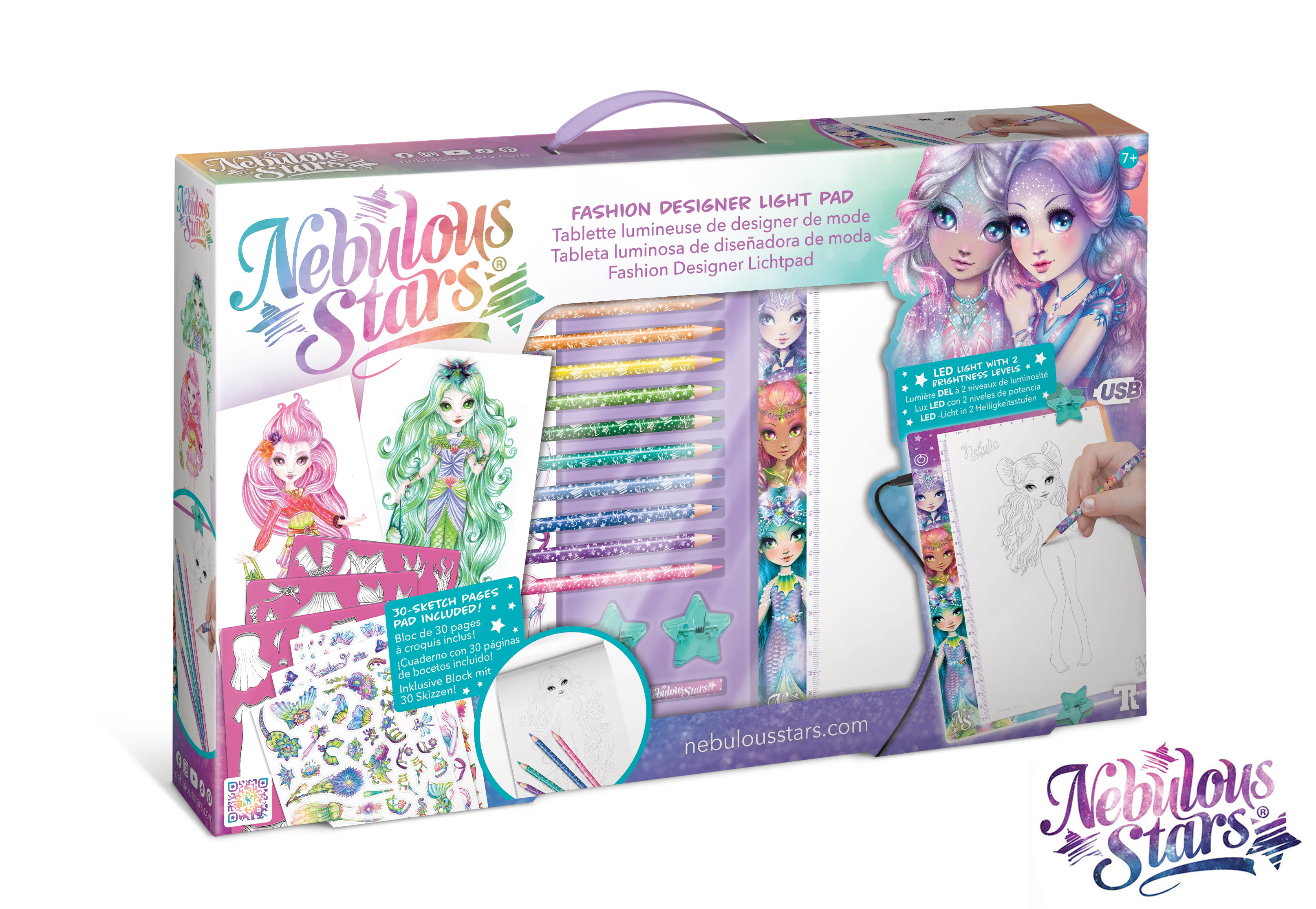 Nebulous Stars Návrhářská podsvícená tabulka. Plocha tabulky 14x25 cm. 2 úrovně jasu. Obsah - podsvícená tabulka, usb kabel, 11 pastelek, 30 šablon, 2 klipy.