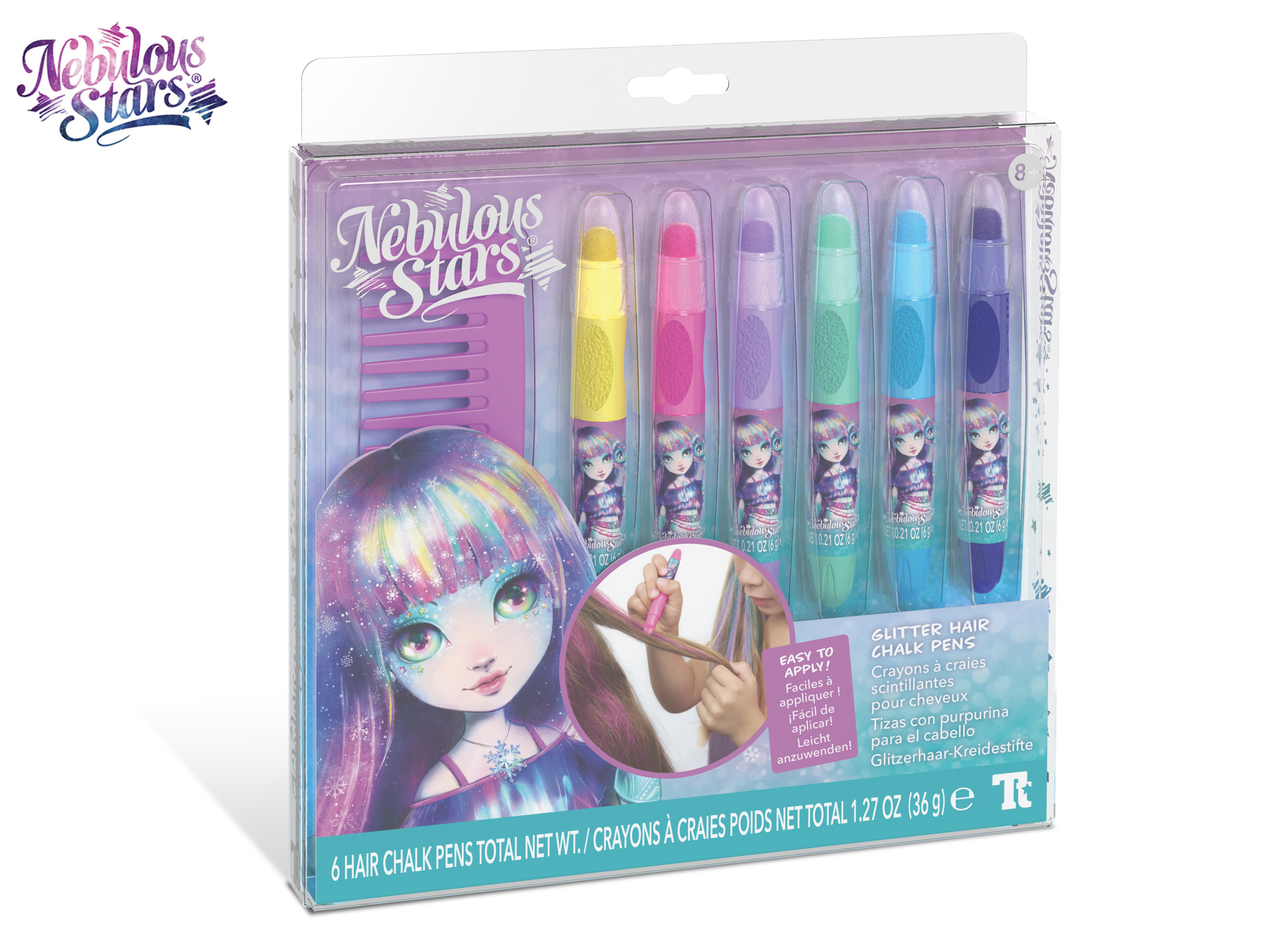 Nebulous Stars Třpytivá pera na vlasy. Obsah balení - 6 třpytivých tužek na vlasy, hřeben a pokyny. Display box - 12ks.