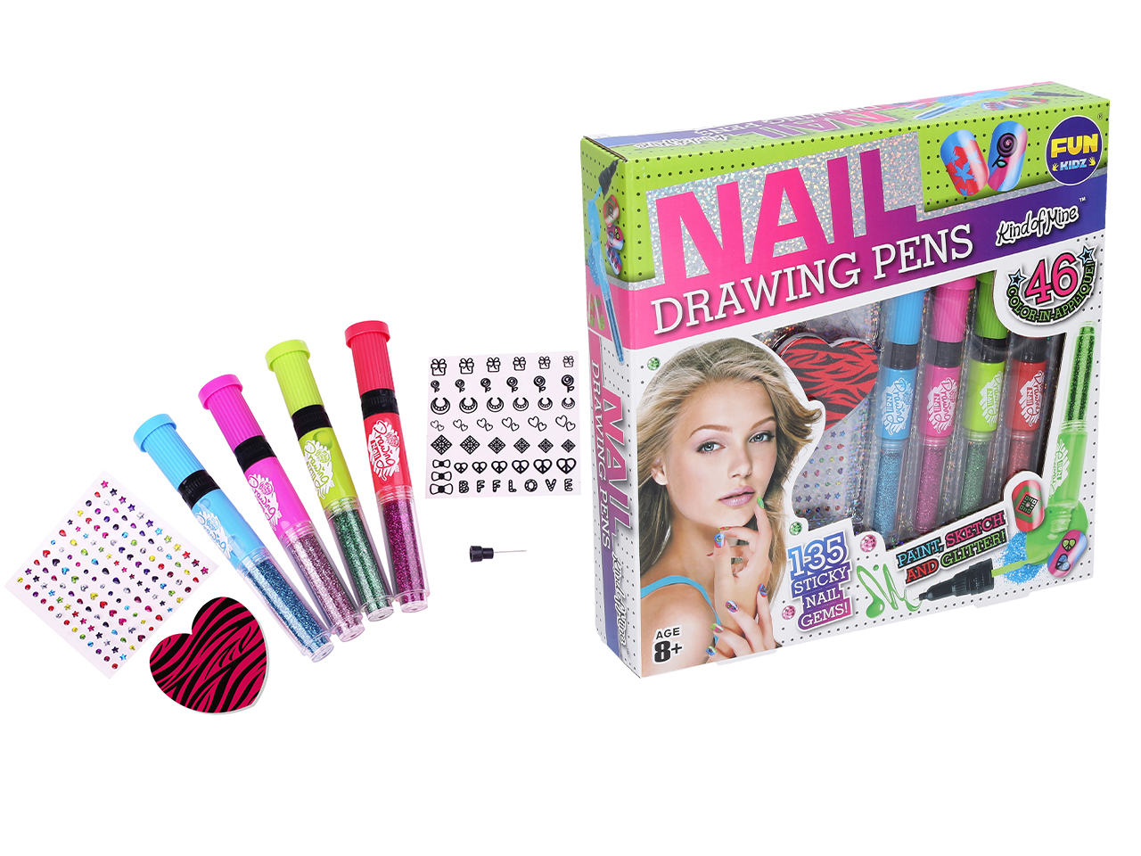 Nehtový set. Balení obsahuje lakovací pera na nehty, flitry, kamínky, nálepky.