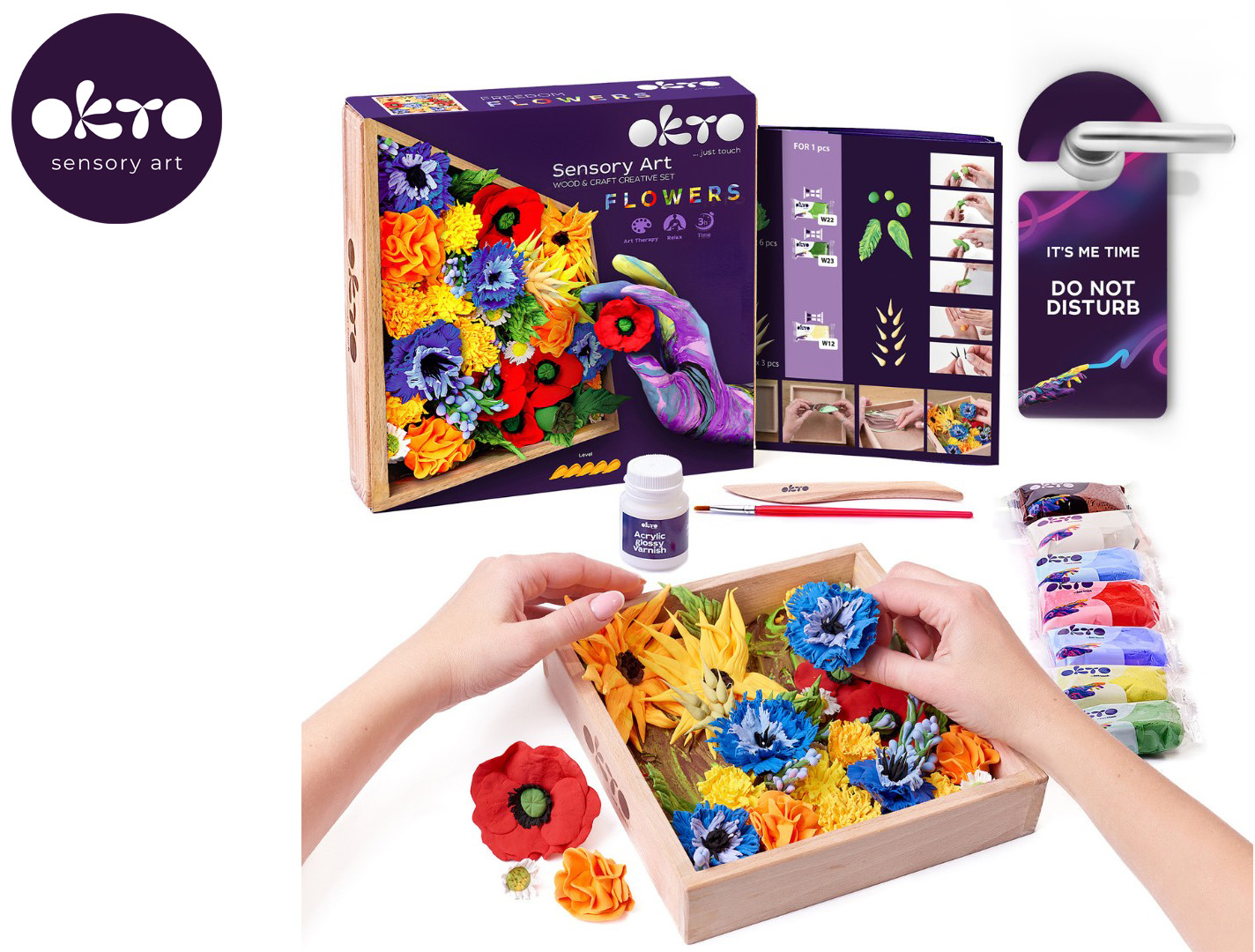 OKTO FREEDOM Výtvarná modelovací sada DIY květiny s dřevěným rámem. Úroveň obtížnosti 5/5. Velikost rámu 21x21 cm. Obsah balení - přírodní plátno, návod, dřevěný tvarovací nástroj, 40ks modelovací hmoty.